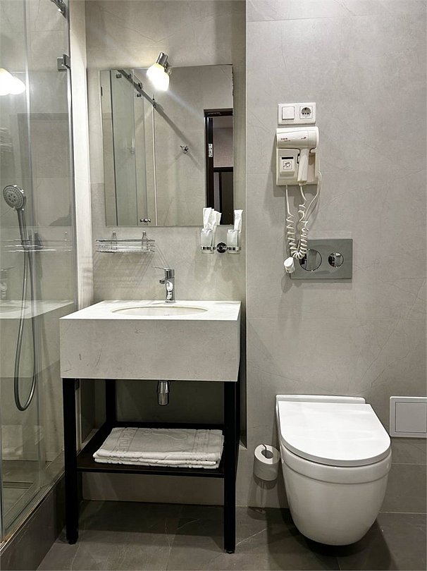 телевизор, спутниковое телевидение, Wi-Fi, телефон, холодильник, система климат-контроля, фен, электронные замки, душевая кабина, санузел, банные принадлежности, банные полотенца, тапочки, двуспальная кровать, стулья, шкаф для одежды, вешалки, письменный стол, обслуживание номеров, сейф, раковина, вид на город, кулер на этаже, вид во двор, без питомцевВ гостиничном номере