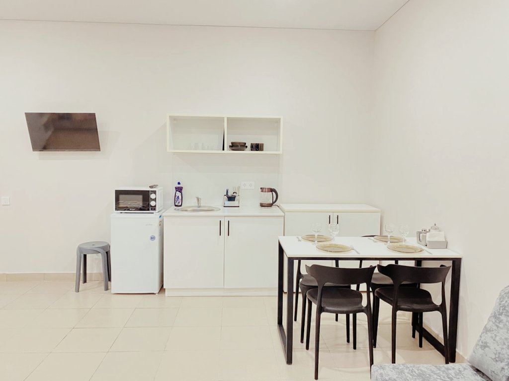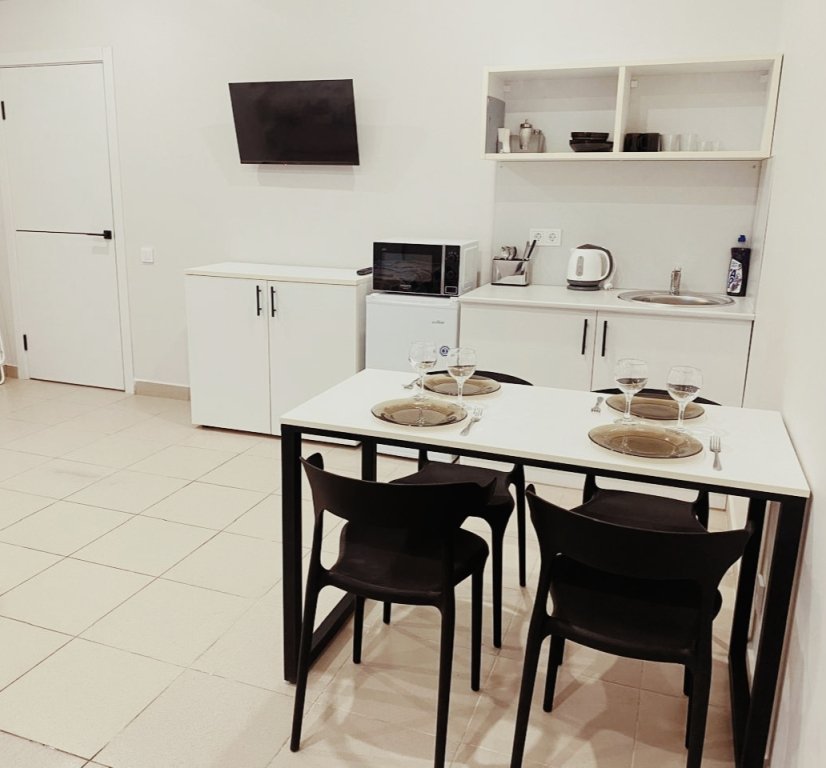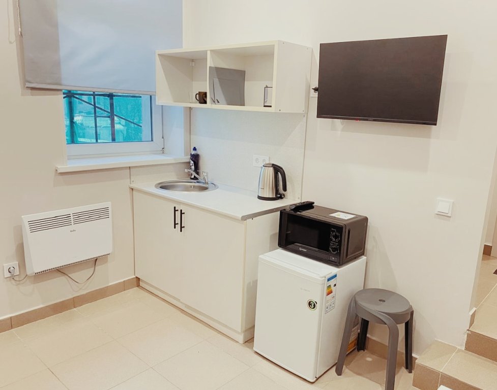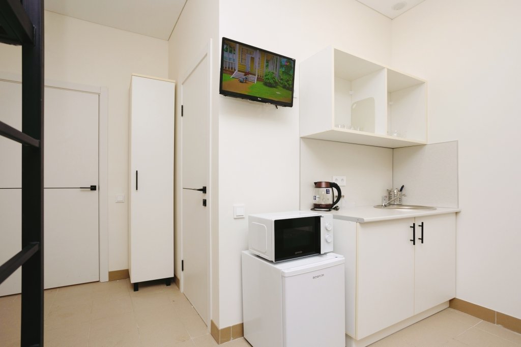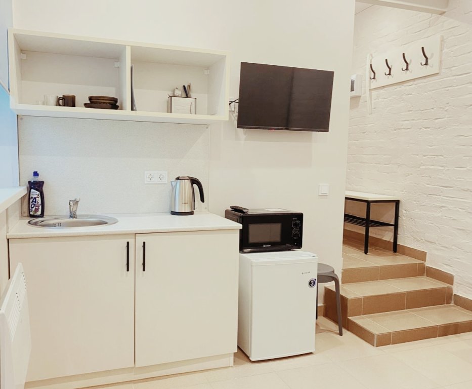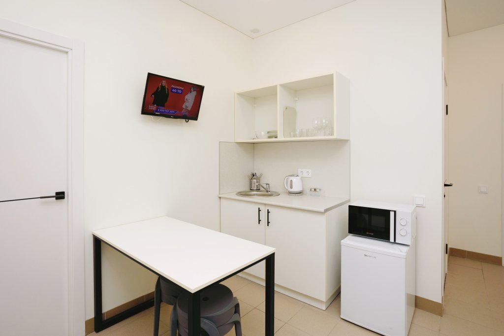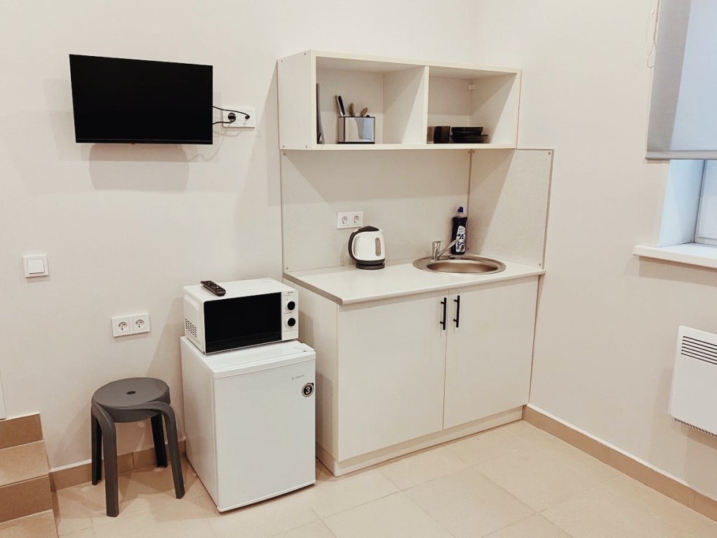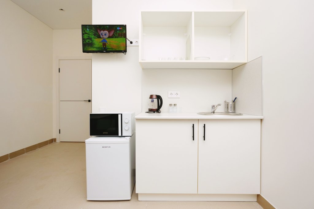 В каждом номере есть мини-кухня, чайник, холодильник и столовые приборы.