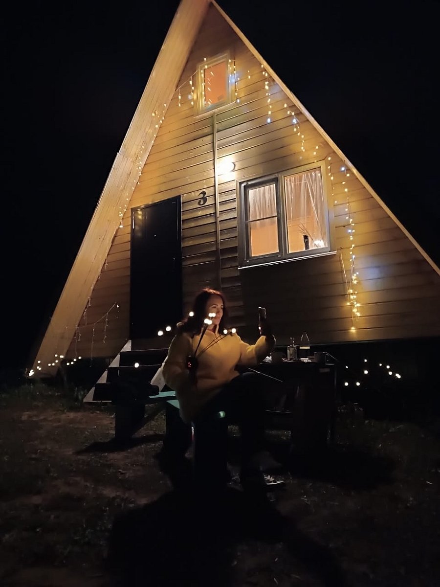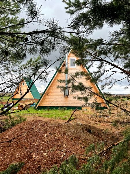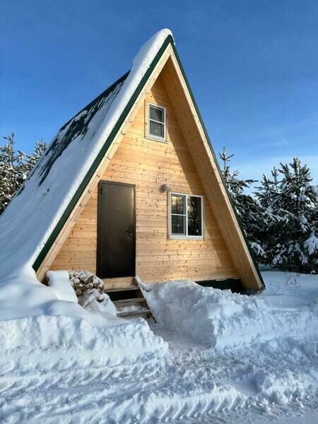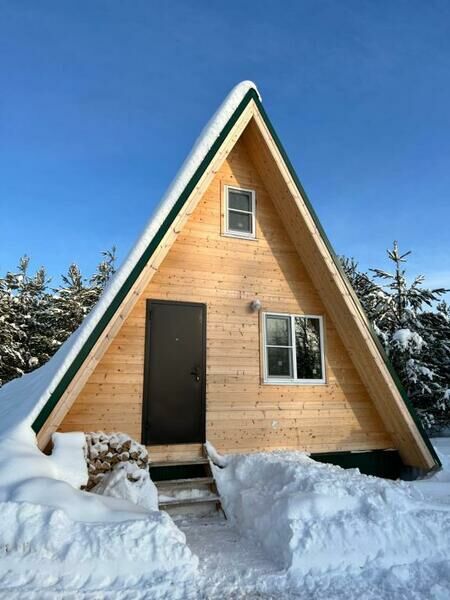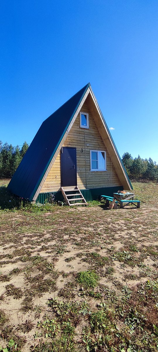 Треугольные дома расположенные в лесу в тишине и уединении. Есть банкетный зал на 20 человек.