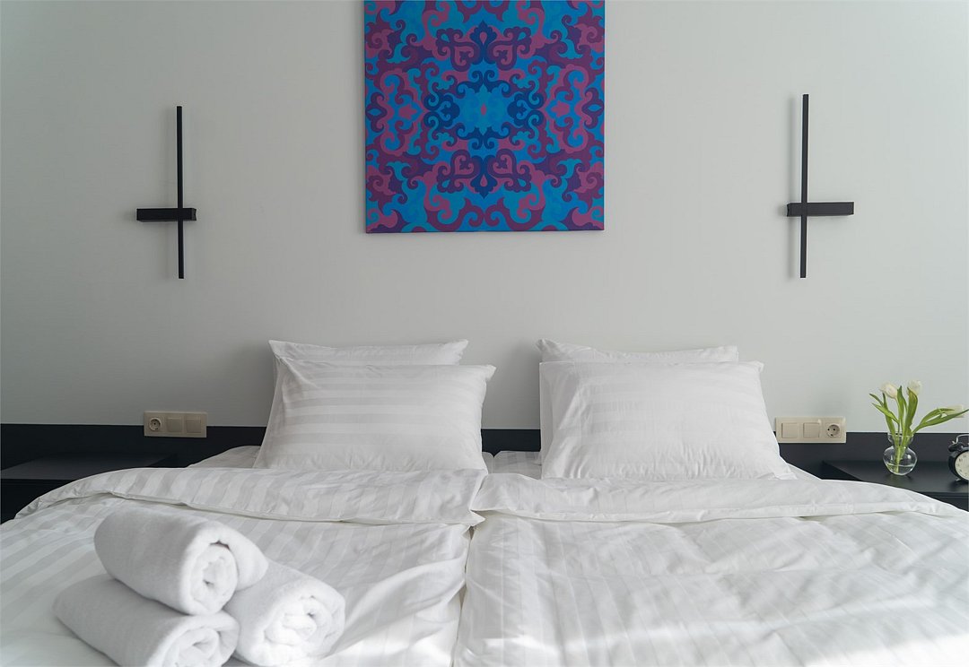Комфорт для Всех. В номере двуспальная кровать. Высокие потолки обеспечивают ощущение простора, а кондиционер поддерживает комфортную температуру. Тропический душ, ортопедические матрасы, шторы, блокирующие свет — идеальное решение для расслабления после активного дня в Казани, будь то выступление, тренировка или осмотр достопримечательностей.Услуги и удобства