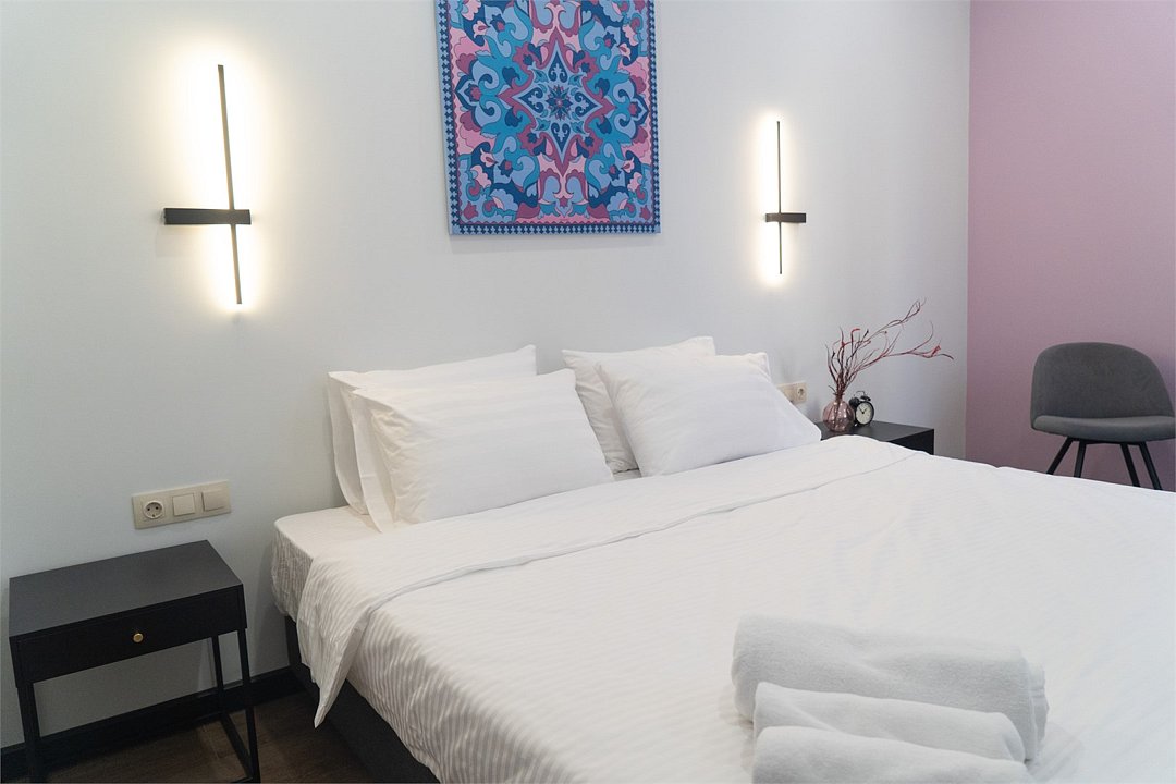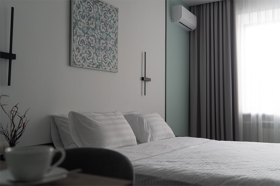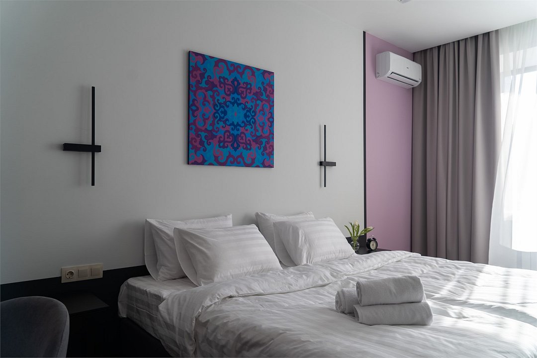 Комфорт и Элегантность с элементами локальной культуры. Стильный Джуниор Сюит - это просторный номер с одной большой кроватью King Size (180*200). Номер может комфортно разместить троих гостей при установке дополнительной кровати, что делает его идеальным выбором для небольших семей или групп друзей. Высокие потолки и кондиционер обеспечивают комфорт. Уютная зона с креслом и журнальным столиком позволяет насладиться моментами расслабления во время пребывания в городе. Тропический душ, ортопедические матрасы, светонепроницаемые шторы— идеальное решение для полноценного отдыха после дня осмотра Казани. Рабочий стол добавляет функциональности.Услуги и удобства