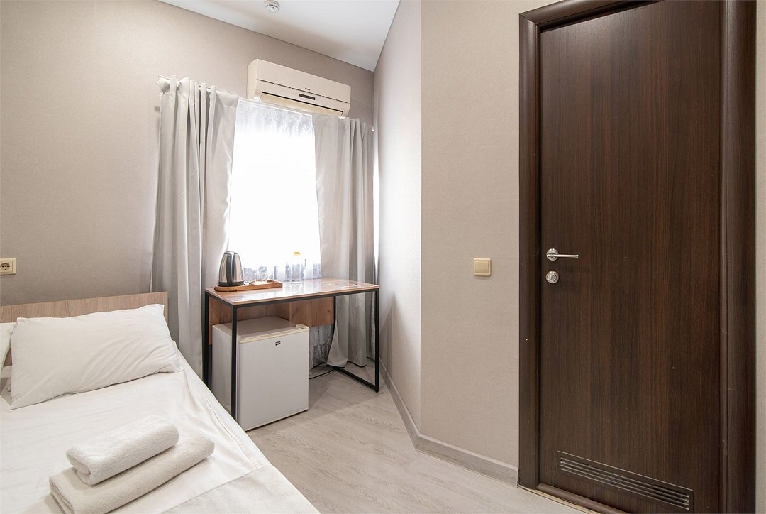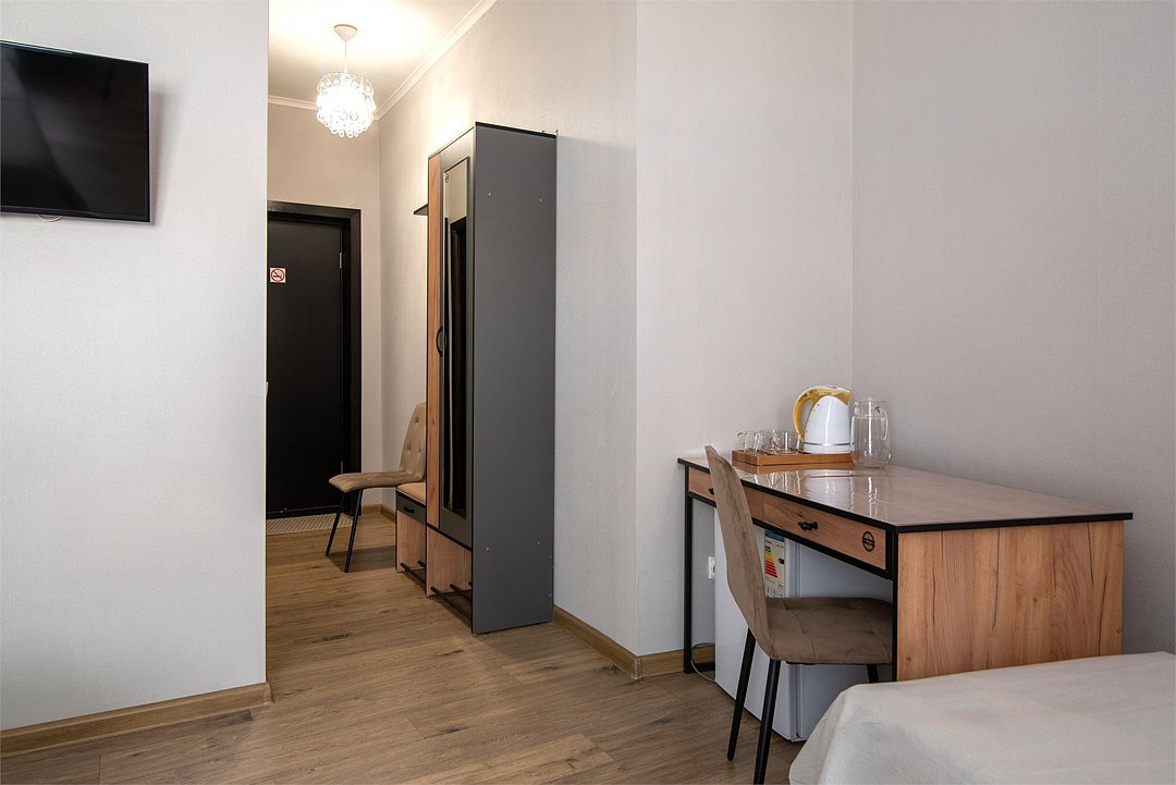 Wi-Fi, интернет, кондиционер, фен, утюг, душевая кабина, банные полотенца, тапочки, гигиенические средства, односпальная кровать, шкаф для одежды, вешалки, письменный стол, зеркало, сейф, чайник, унитаз, раковина, вид на город, кулер на этаже, вид во двор, ламинат, стаканы, стул, тумба, телевизор с плоским экраном, мини-холодильник, москитная сетка, гостиничная парфюмерия, номер для некурящихВ номере