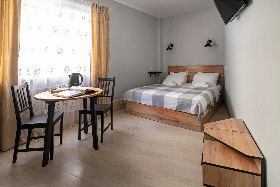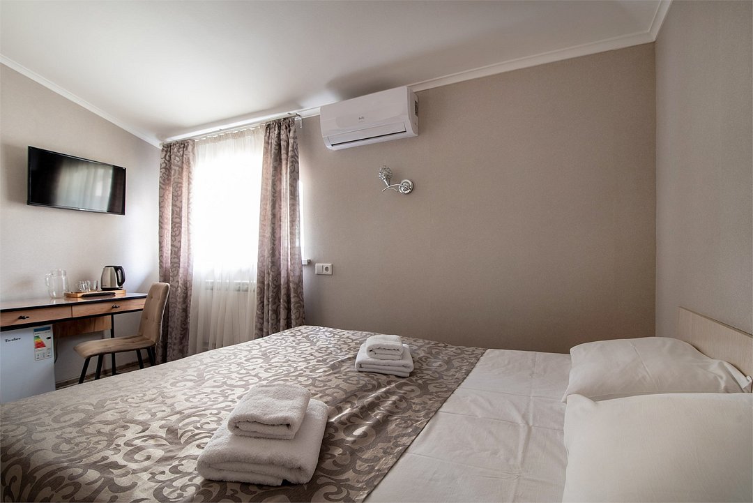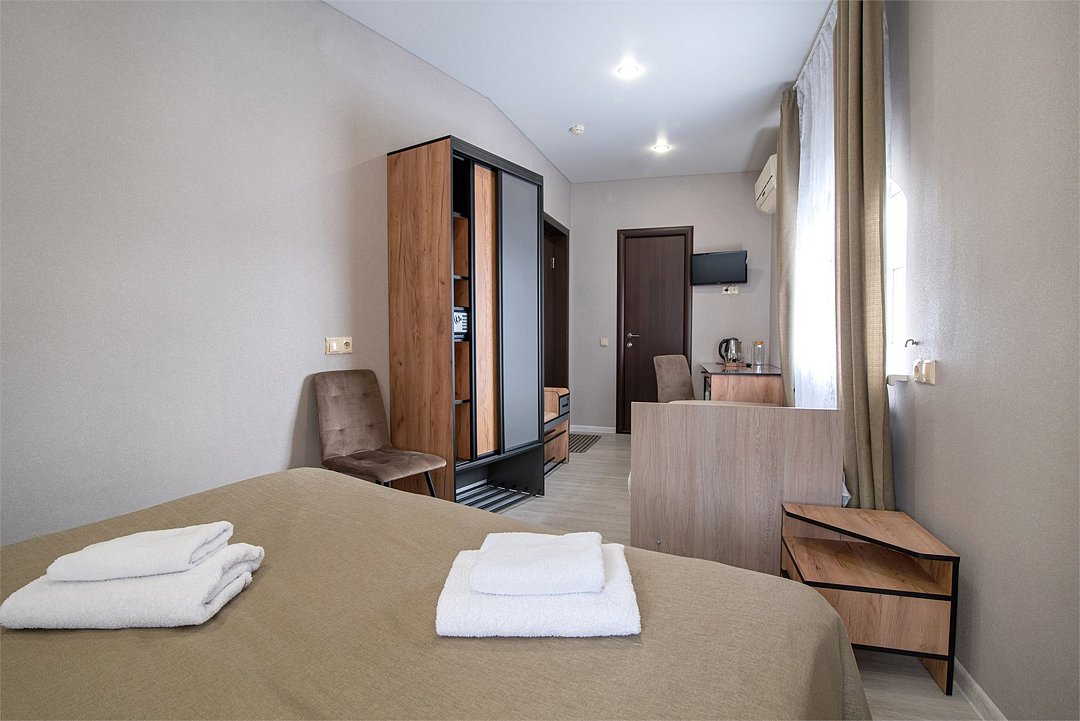 Wi-Fi, интернет, кондиционер, фен, электронные замки, микроволновая печь, утюг, душевая кабина, санузел, теплый пол, банные полотенца, тапочки, гигиенические средства, две односпальные или большая двуспальная кровать, гладильная доска, шкаф для одежды, вешалки, письменный стол, зеркало, сейф, чайник, унитаз, раковина, питьевая вода, отопление, кулер на этаже, вид во двор, ламинат, стаканы, стул, тумба, туалетные средства, телевизор с плоским экраном, мини-холодильник, москитная сетка, теплые полы, номер для некурящих, уборка номера, мылоВ номере
