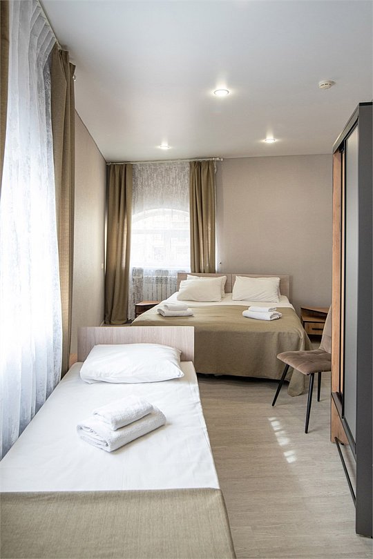 Wi-Fi, интернет, кондиционер, душевая кабина, банные полотенца, тапочки, гигиенические средства, двуспальная кровать, две односпальные кровати, шкаф для одежды, вешалки, письменный стол, зеркало, чайник, унитаз, раковина, вид на город, кулер на этаже, вид во двор, ламинат, стаканы, стул, тумба, телевизор с плоским экраном, мини-холодильник, москитная сетка, гостиничная парфюмерия, номер для некурящих, уборка номераВ номере