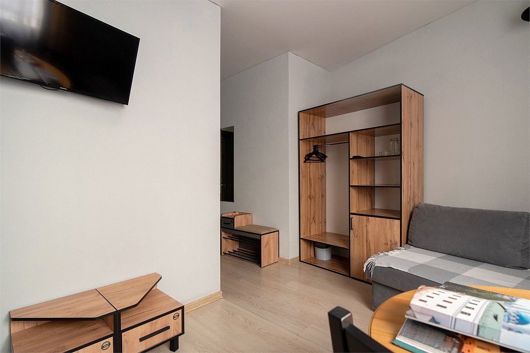 Wi-Fi, интернет, кондиционер, фен, утюг, душевая кабина, банные полотенца, тапочки, гигиенические средства, двуспальная кровать, шкаф для одежды, вешалки, письменный стол, зеркало, чайник, унитаз, раковина, вид на город, кулер на этаже, вид во двор, ламинат, стул, тумба, телевизор с плоским экраном, мини-холодильник, москитная сетка, гостиничная парфюмерия, номер для некурящих, двуспальный раскладной диван-кроватьВ номере
