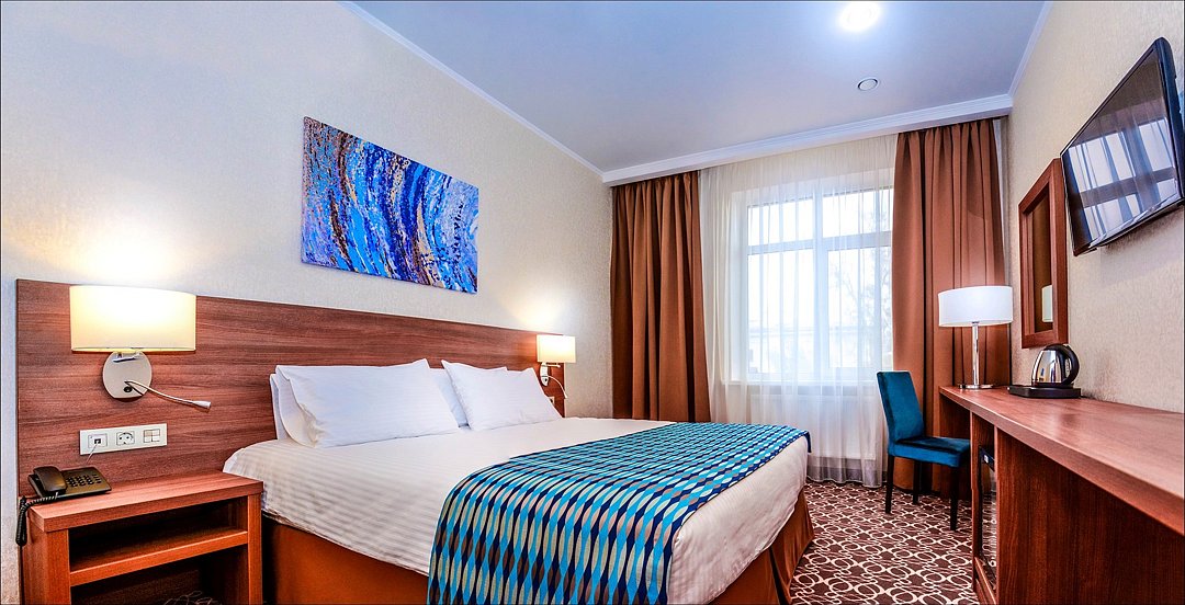 Мы продумали дизайн номера категории Стандарт до мельчайших деталей.Номер выполнен в теплых спокойных тонах и оснащен всеми необходимыми удобствами. Белоснежное постельное белье, пушистые полотенца, мягкий махровый халат и качественная косметика позволят погрузиться в атмосферу уюта и комфорта.Набор для приготовления чая и кофе позволят насладиться горячим напитком в конце дня.Услуги и удобства