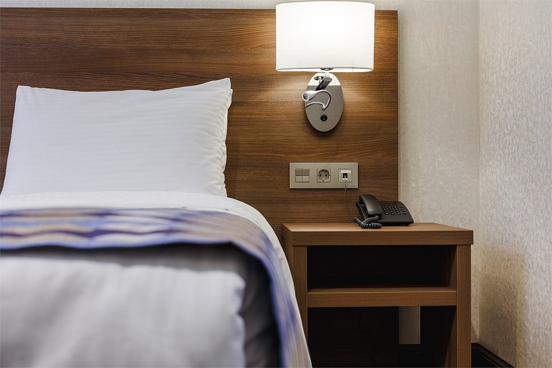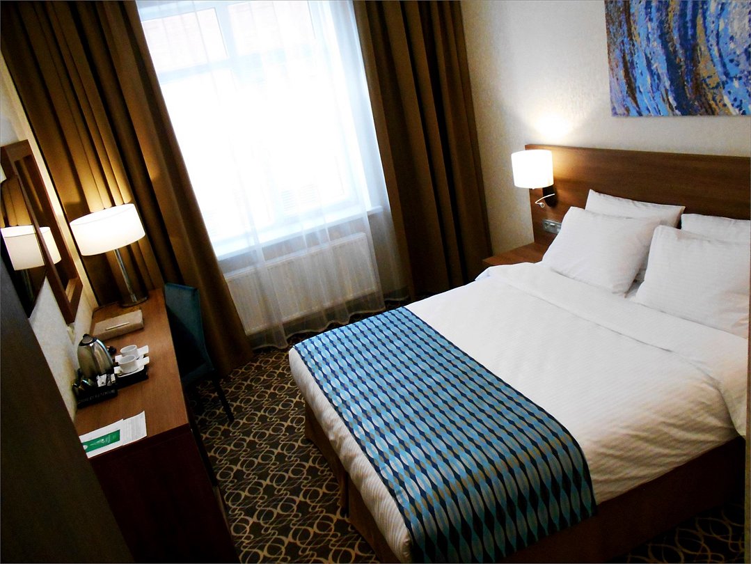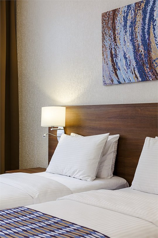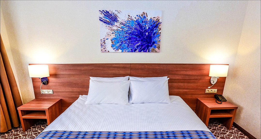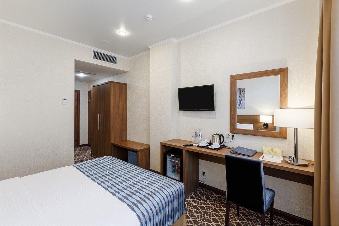 Мы продумали дизайн номера категории Стандарт до мельчайших деталей. Номер выполнен в теплых спокойных тонах и оснащен всеми необходимыми удобствами. Белоснежное постельное белье, пушистые полотенца, мягкий махровый халат и качественная косметика позволят погрузиться в атмосферу уюта и комфорта. Набор для приготовления чая и кофе позволят насладиться горячим напитком в конце дня.Услуги и удобства