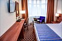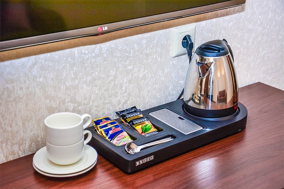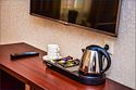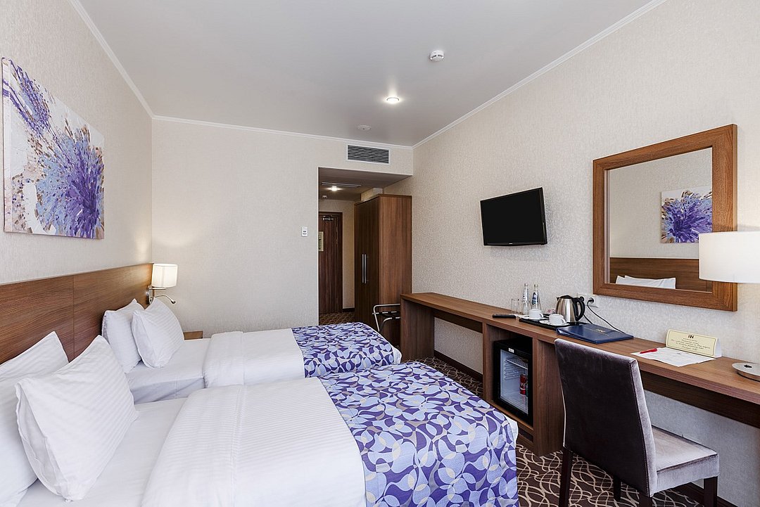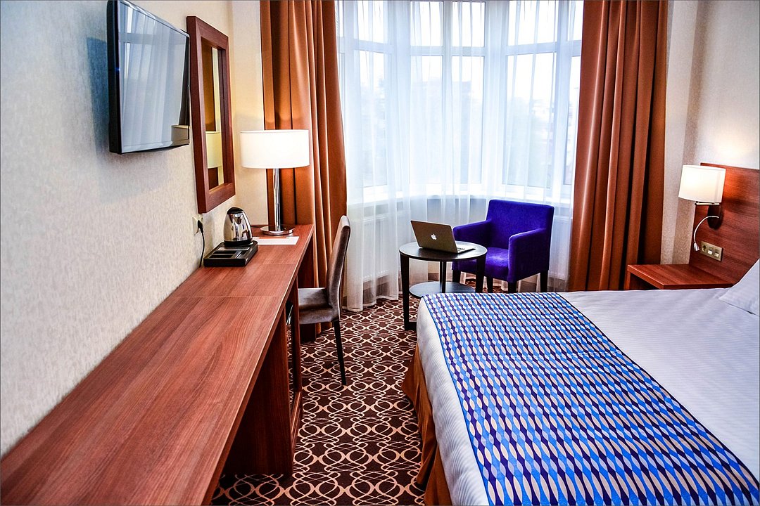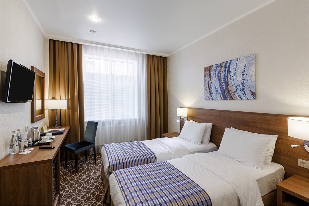 телевизор, кабельное телевидение, Wi-Fi, телефон, кондиционер, светильник, настольные лампы, фен, электронные замки, ванная комната, душевая кабина, халаты, банные полотенца, тапочки, гигиенические средства, косметические средства, две односпальные или большая двуспальная кровать, гладильная доска, тумбы, стулья, шкаф для одежды, вешалки, письменный стол, багажная тумба, зеркало, мини-бар, письменные принадлежности, чайный набор, обслуживание номеров, информационная карта, меню, сейф, чайник, унитаз, раковина, косметическое зеркало, питьевая вода, ковровое покрытие, отопление, душ, вид на город, центральное кондиционированиеВ номере