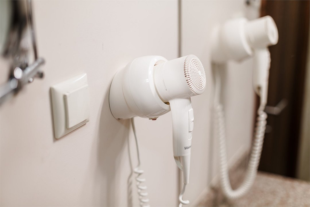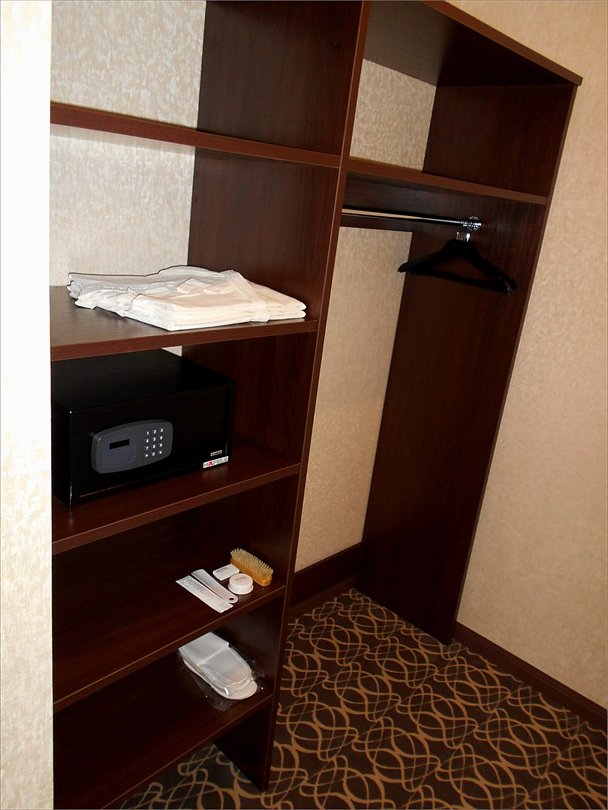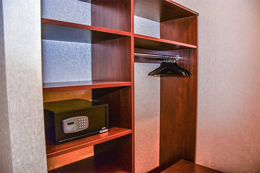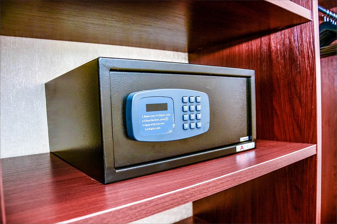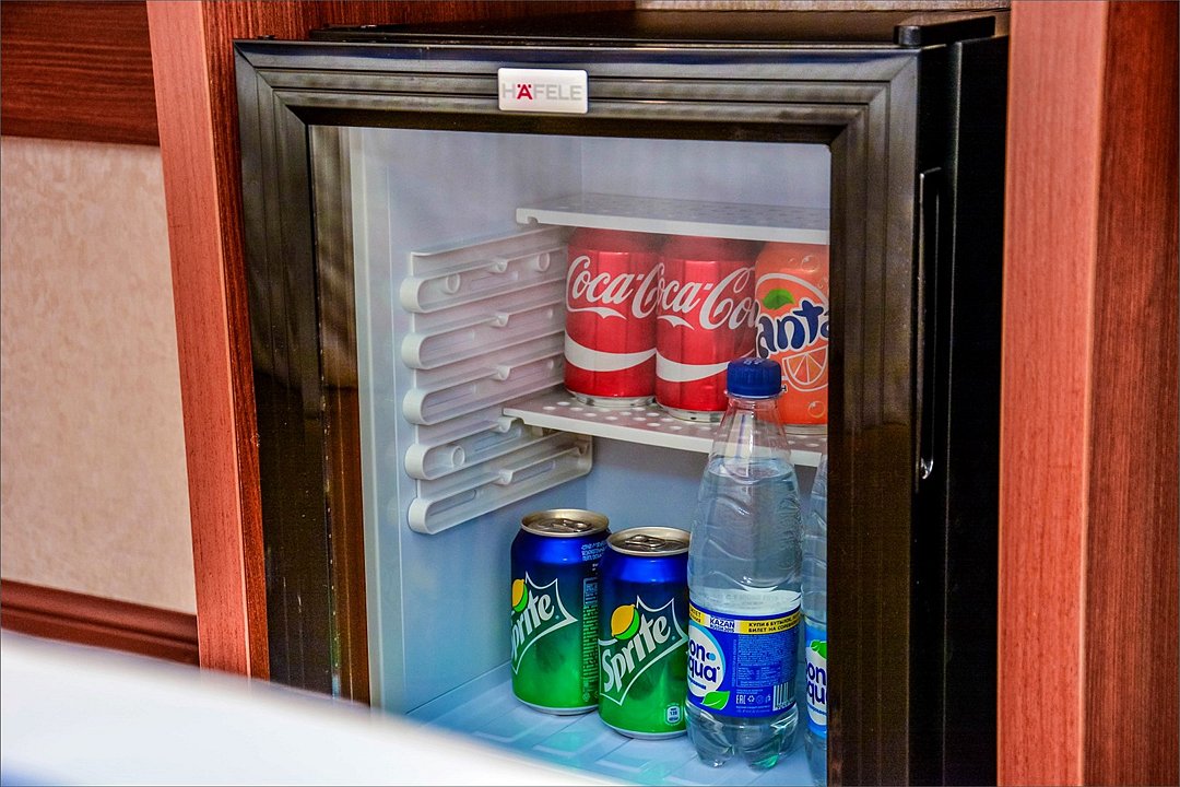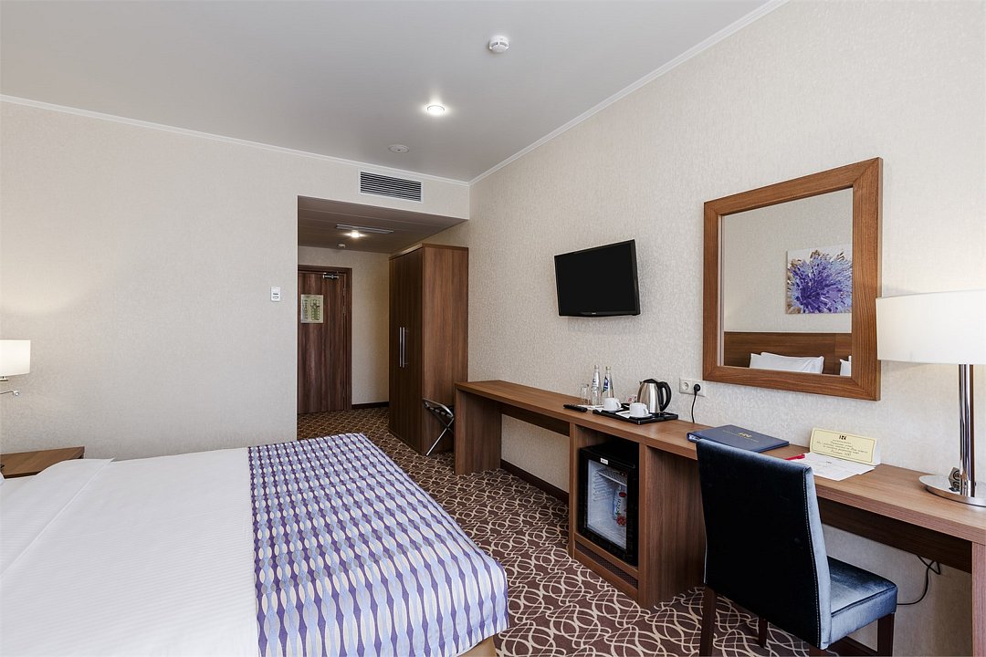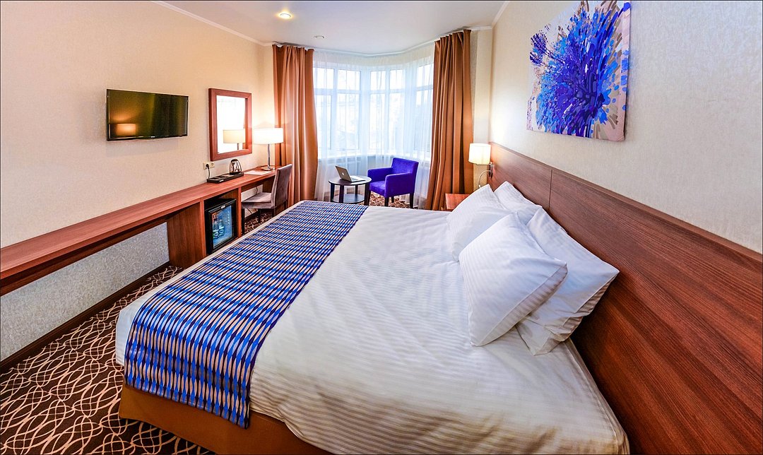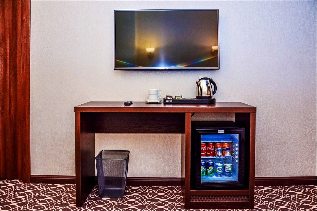 телевизор, кабельное телевидение, Wi-Fi, телефон, холодильник, система климат-контроля, светильник, настольные лампы, фен, электронные замки, ванная комната, душевая кабина, санузел, халаты, банные полотенца, тапочки, гигиенические средства, кровать «King size», две односпальные или большая двуспальная кровать, гладильная доска, ортопедический матрас, тумбы, стулья, шкаф для одежды, вешалки, журнальный столик, письменный стол, зеркало, мини-бар, письменные принадлежности, чайный набор, информационная карта, меню, сейф, чайник, унитаз, раковина, косметическое зеркало, питьевая вода, ковровое покрытие, отопление, вид на город, кресло, центральное кондиционированиеВ номере