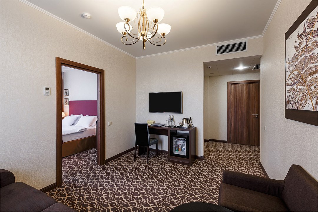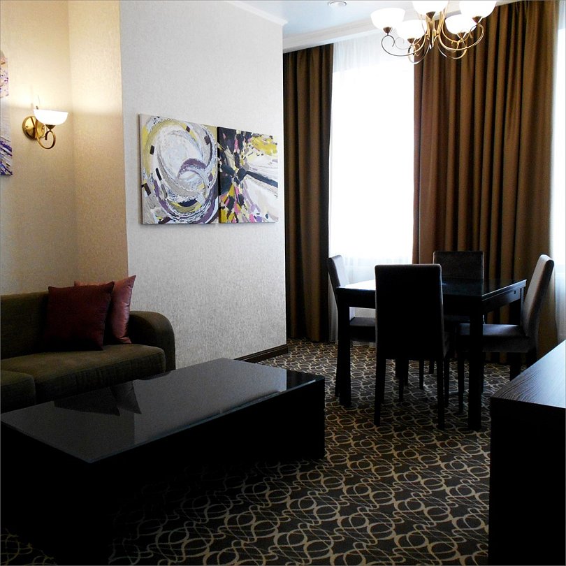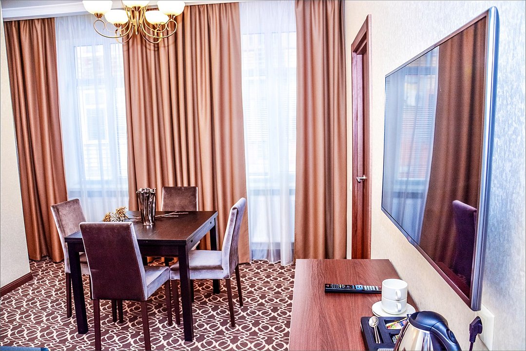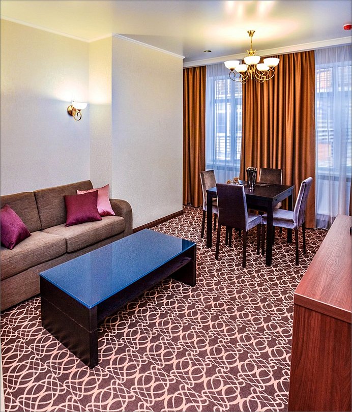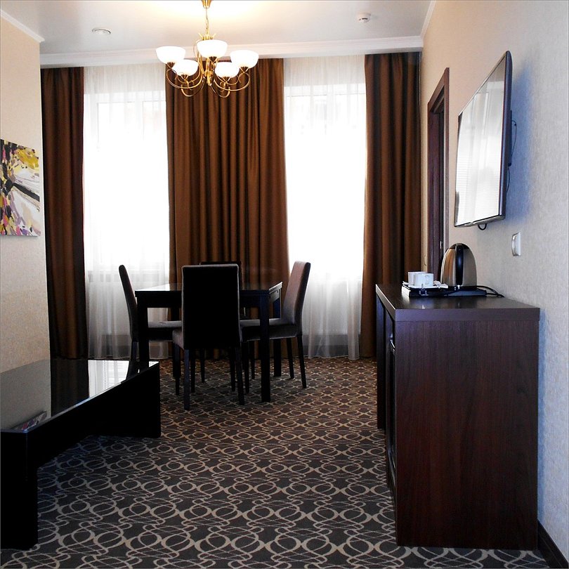 Насладитесь уютом после насыщенного дня. Мы старались сделать Ваше проживание в нашем номере люкс максимально удобным и поэтому разделили спальное пространство и гостиную. В этом номере для всего найдется свое особое пространство: будь то просмотр телевизора, неспешное чаепитие или работа с документами. Белоснежное постельное белье, просторная элегантная ванная комната и качественная косметика - все учтено, чтобы сделать Ваше пребывание комфортным и приятным.Услуги и удобства
