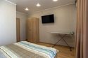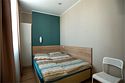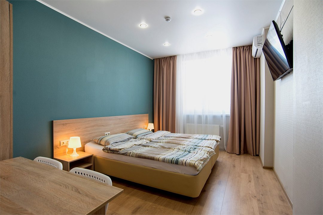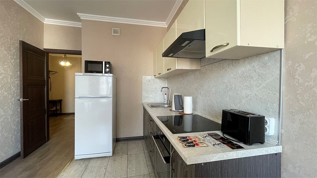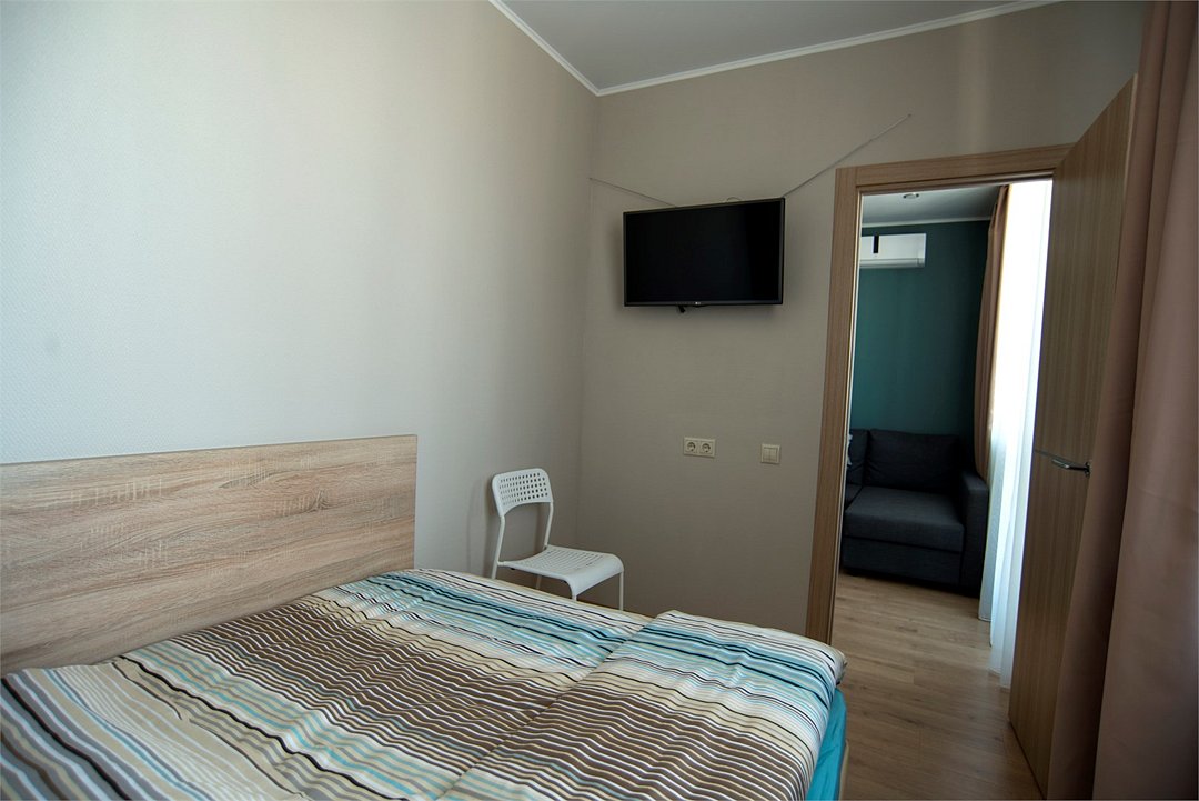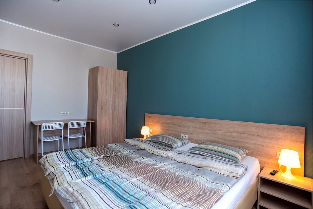 Апартаменты с отдельной кухней и спальней. На кухне угловой диван, раскладывающийся в полноценное 2 спальное место. Для дивана предусмотрен дополнительный матрас. В спальне двуспальная кровать 160*200. Предусмотрен кондиционер, Wi-Fi. Ванная комната совмещена с туалетом. Каждому гостю предоставляется комплект полотенец- банное и лицевое. Кухня укомплектована всей необходимой посудой, техникой и столовыми приборами для приготовления еды. Доплата за проживание с питомцем составляет 1500 рублей.Услуги и удобства