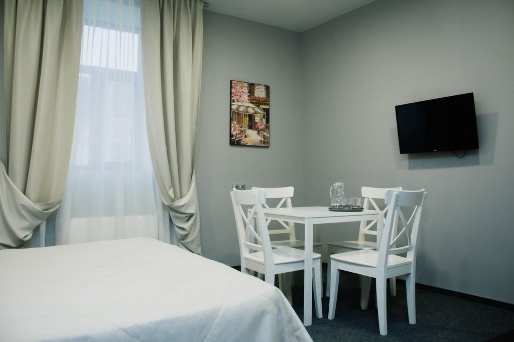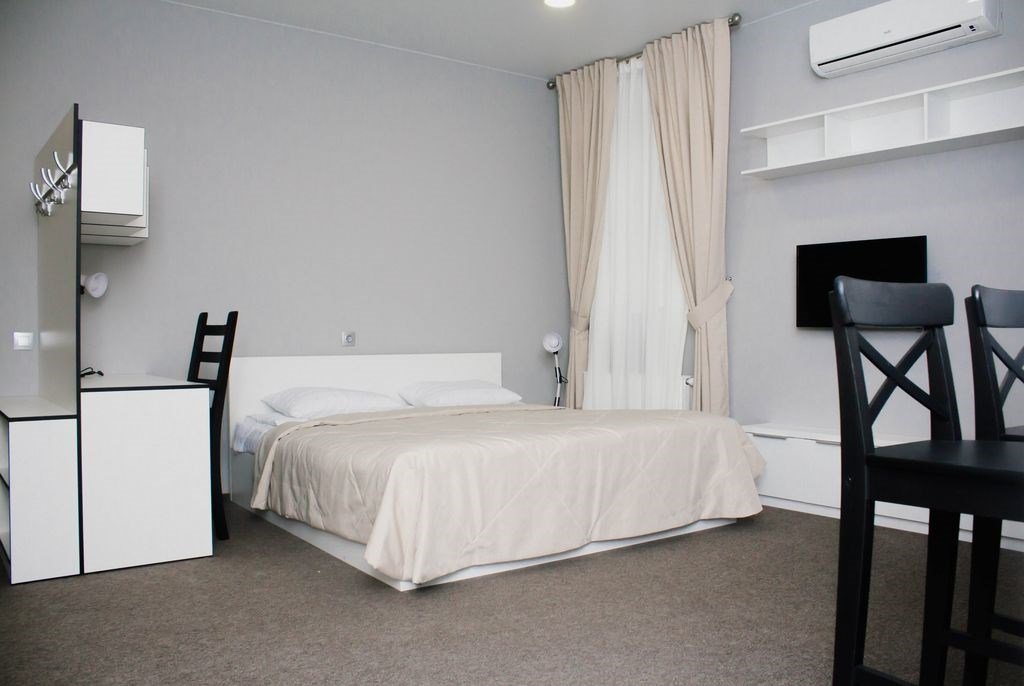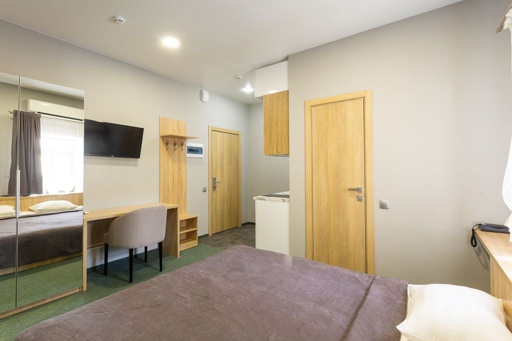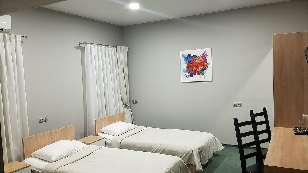 Уютный номер для размещения одного или двух человек. В комнате две односпальные кровать, прикроватные тумбочки, обеденный стол, стулья, чайник, микроволновая печь, холодильник,варочная панель, телефон, телевизор, шкаф. Все номера оборудованы кондиционерами. В каждом номере нашего отеля работает бесплатный Wi-Fi.Услуги и удобства