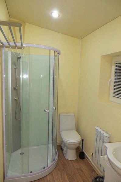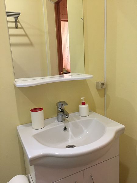 В ванной: туалет, раковина, душевая кабина, сауна, зеркало, набор полотенец.