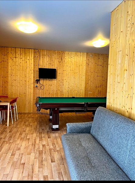 Четырёхместный номер с бильярдом, диваном, телевизором, столом и стульями, двуспальной кроватью, микроволновкой, холодильником, чайником, санузлом с душем