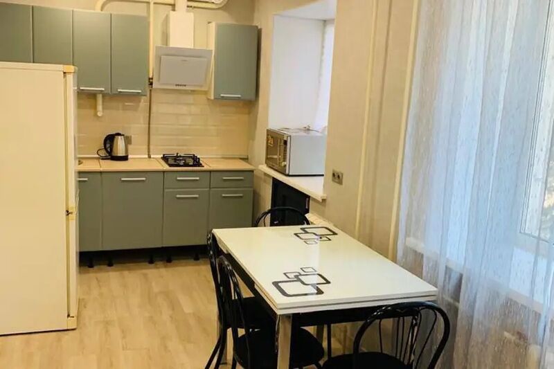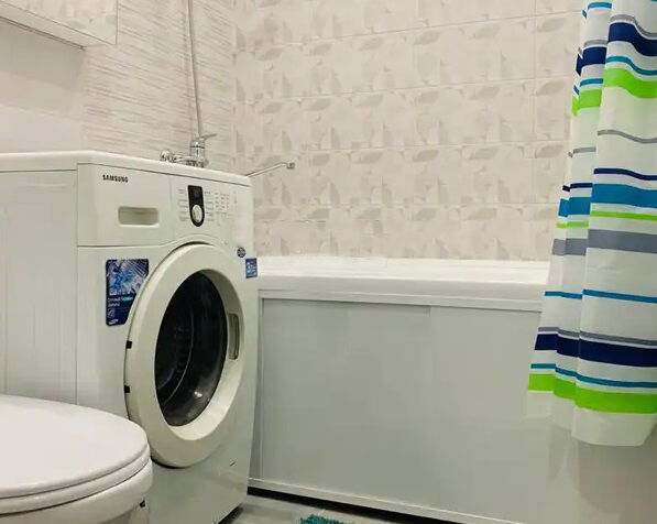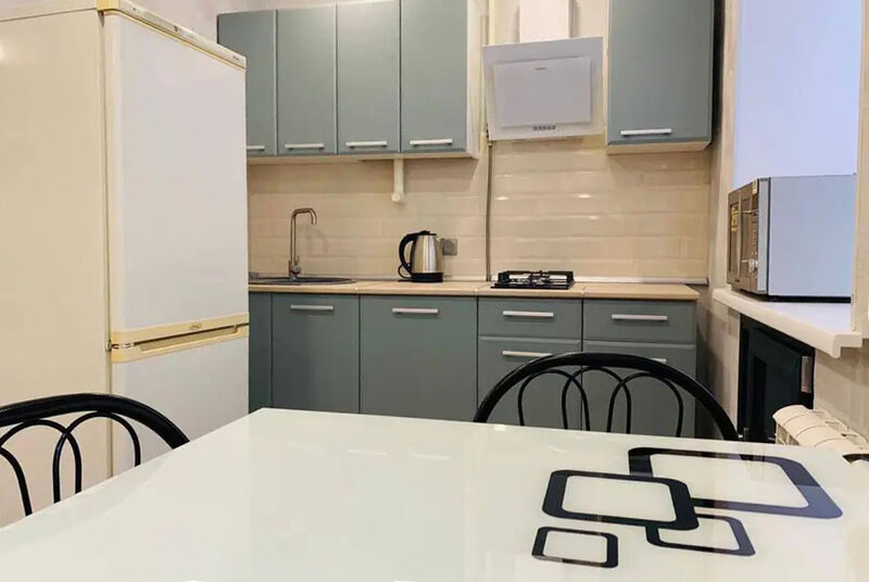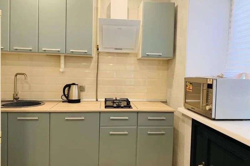 Компактная кухня оборудована всей необходимой для комфортного проживания современной бытовой техникой; есть посуда. Также можно воспользоваться утюгом и стиральной машиной. Установлен высокоскоростной Wi-Fi.