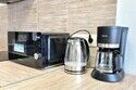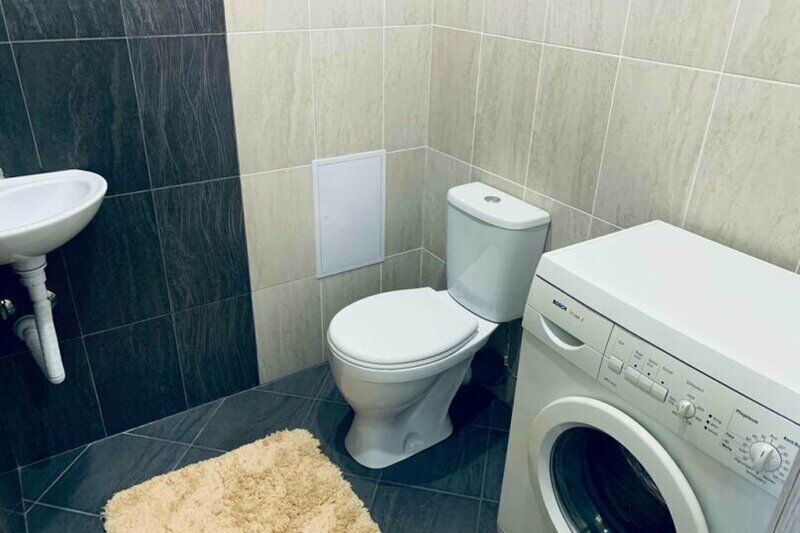 Компактная кухня включает в себя всё необходимое для трапезы: духовая печь, микроволновая печь и посуда. Также для удобства постояльцев установлена стиральная машины, утюг и сеть Wi-Fi.