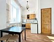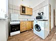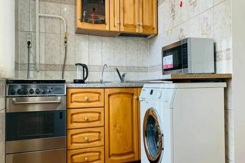 На компактной кухне умещено всё необходимое: посуда, микроволновая и духовая печь. Также есть стиральная машина, утюг и Wi-Fi.