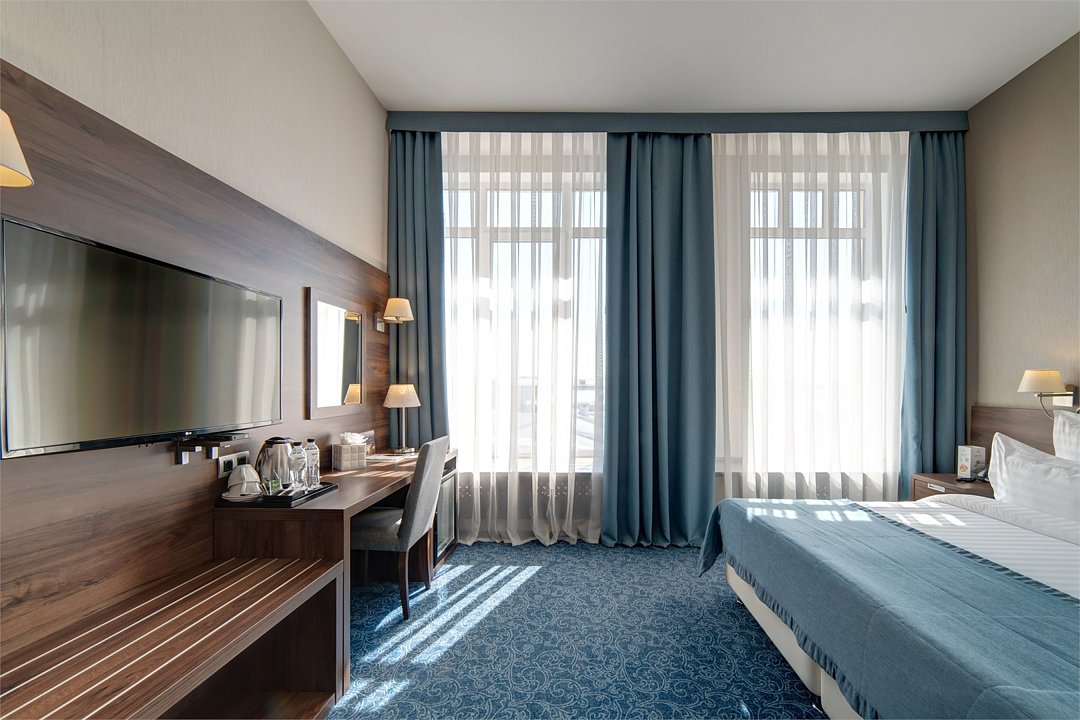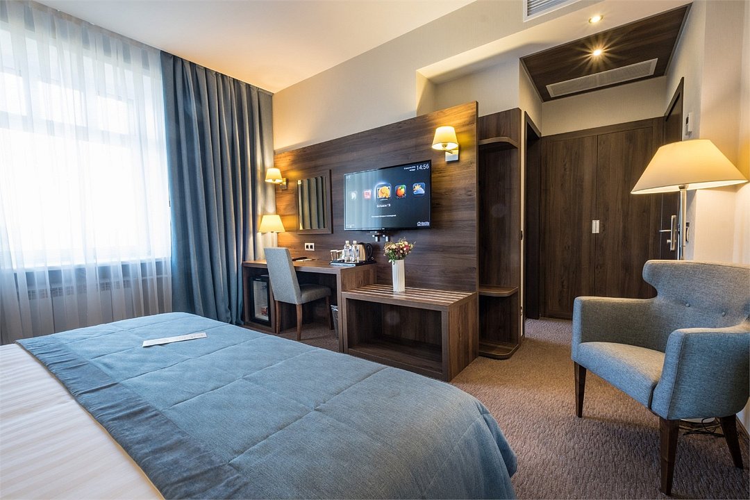 телевизор, интерактивное телевидение, подборка видео/аудио, Wi-Fi, телефон, кондиционер, светильник, настольные лампы, фен, система безопасности, электронные замки, утюг, душевая кабина, банные принадлежности, халаты, банные полотенца, тапочки, гигиенические средства, косметические средства, две односпальные или большая двуспальная кровать, гладильная доска, тумбы, стулья, шкаф для одежды, вешалки, письменный стол, багажная тумба, зеркало, мини-бар, письменные принадлежности, свежая пресса, чайный набор, обслуживание номеров, информационная карта, меню, сейф, минеральная вода, чайник, унитаз, раковина, питьевая вода, ковровое покрытие, отопление, кулер на этаже, вид на рекуВ номере