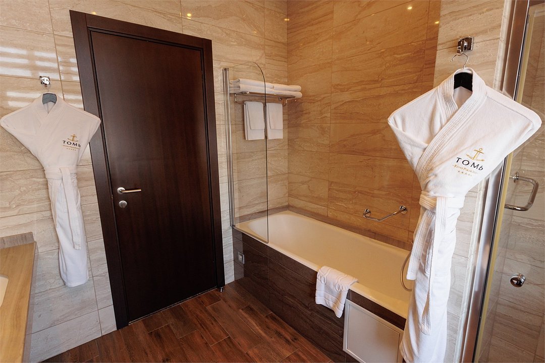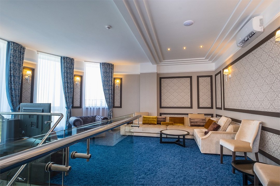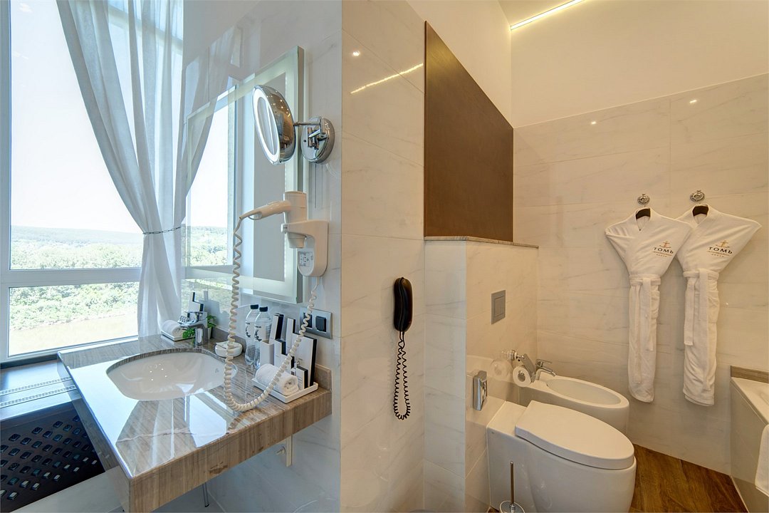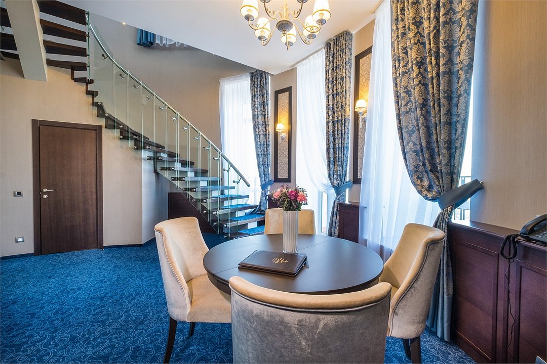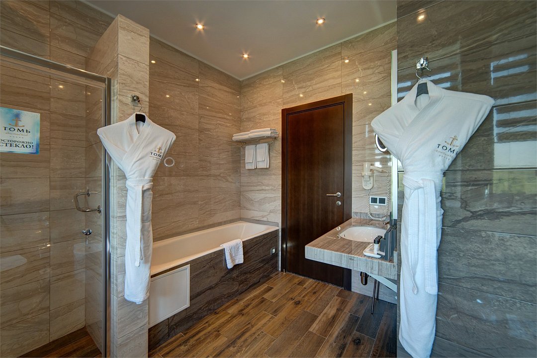 Роскошный двухэтажный номер с балконом, с панорамным видом на реку Томь. Пространство номера разделено на зоны: спальную, гостиную с обеденной группой и уютной мягкой мебелью. Забота о гостях декларируется в отеле как главная ценность, поэтому в номере найдется все необходимое для вашего удобства: от бутилированной питьевой воды до банных принадлежностей, халата и тапочек.Услуги и удобства
