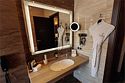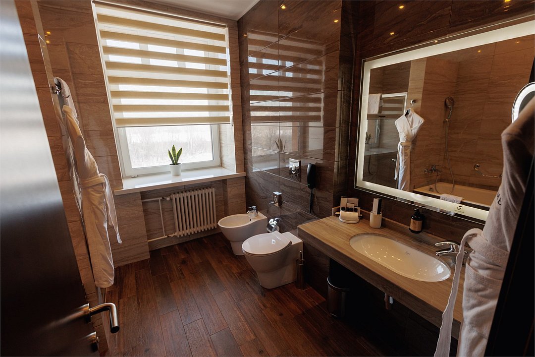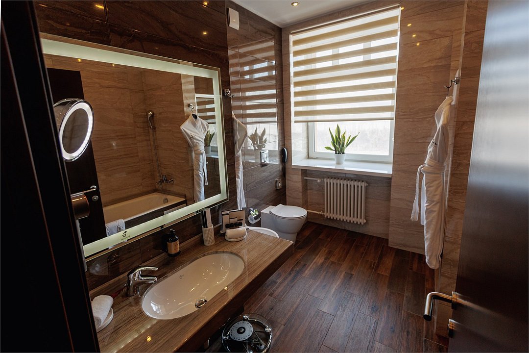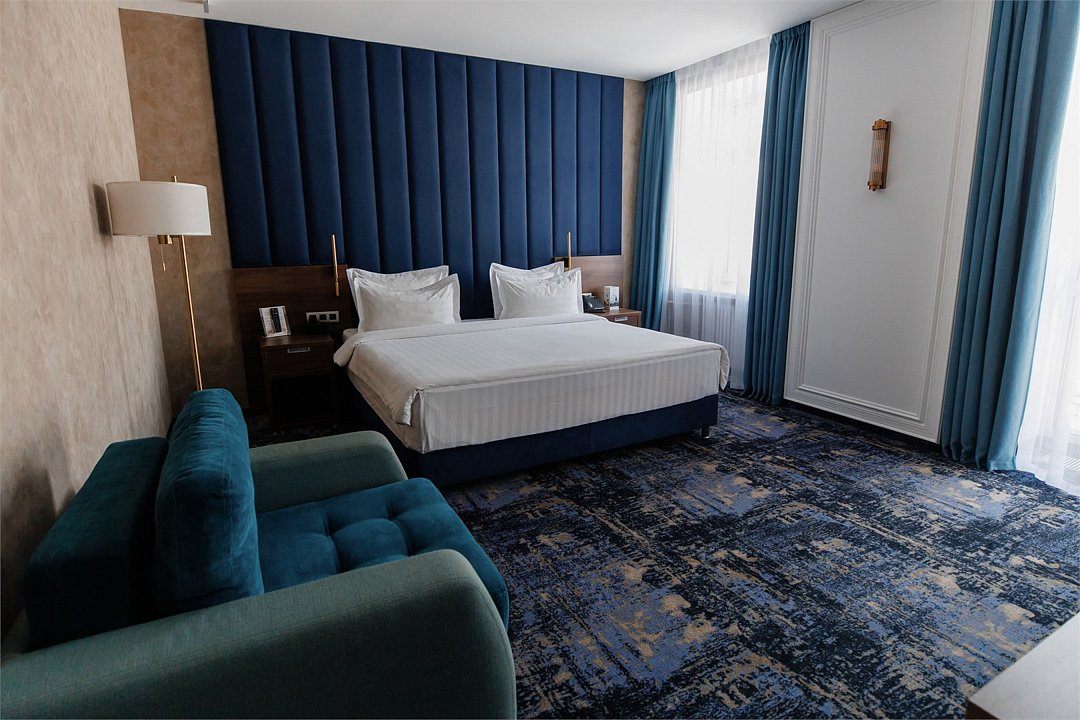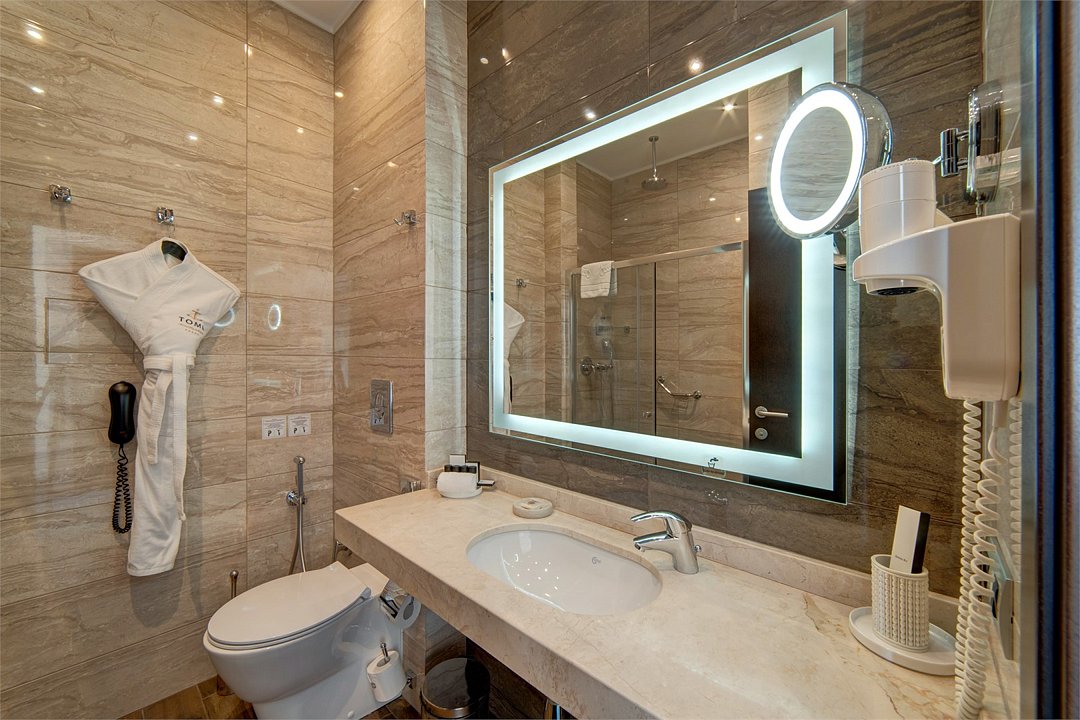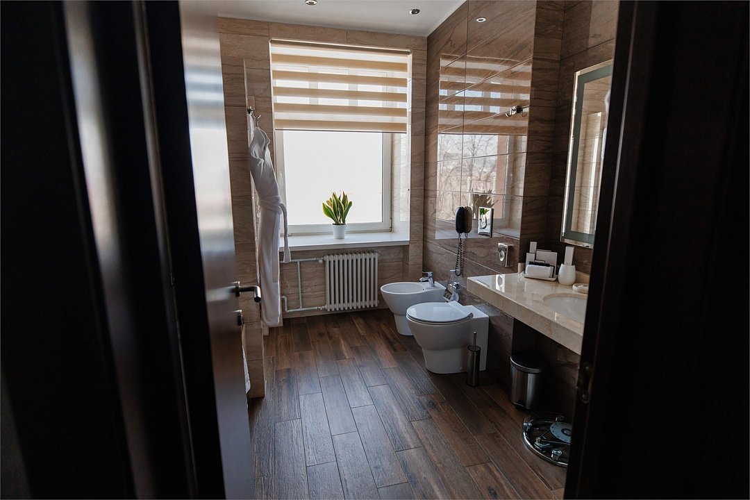 Роскошный двухэтажный номер с балконом, с панорамным видом на реку Томь. Пространство номера разделено на зоны: спальную, гостиную с обеденной группой и уютной мягкой мебелью. Забота о гостях декларируется в отеле как главная ценность, поэтому в номере найдется все необходимое для вашего удобства: от бутилированной питьевой воды до банных принадлежностей, халата и тапочек.Услуги и удобства