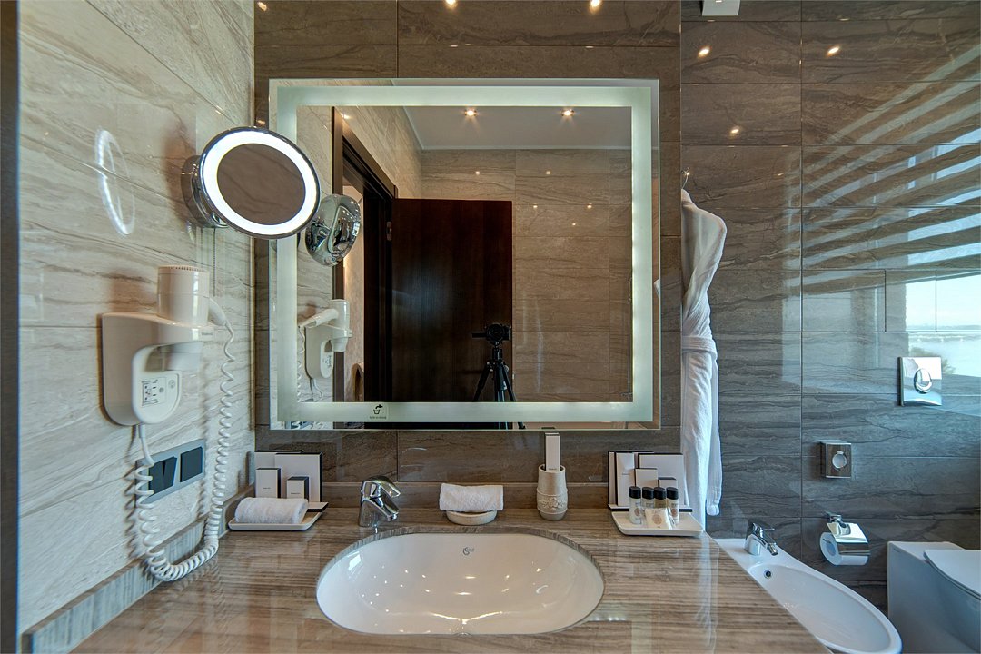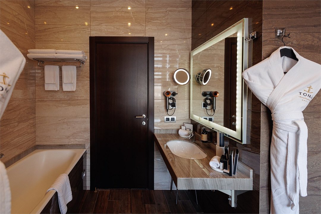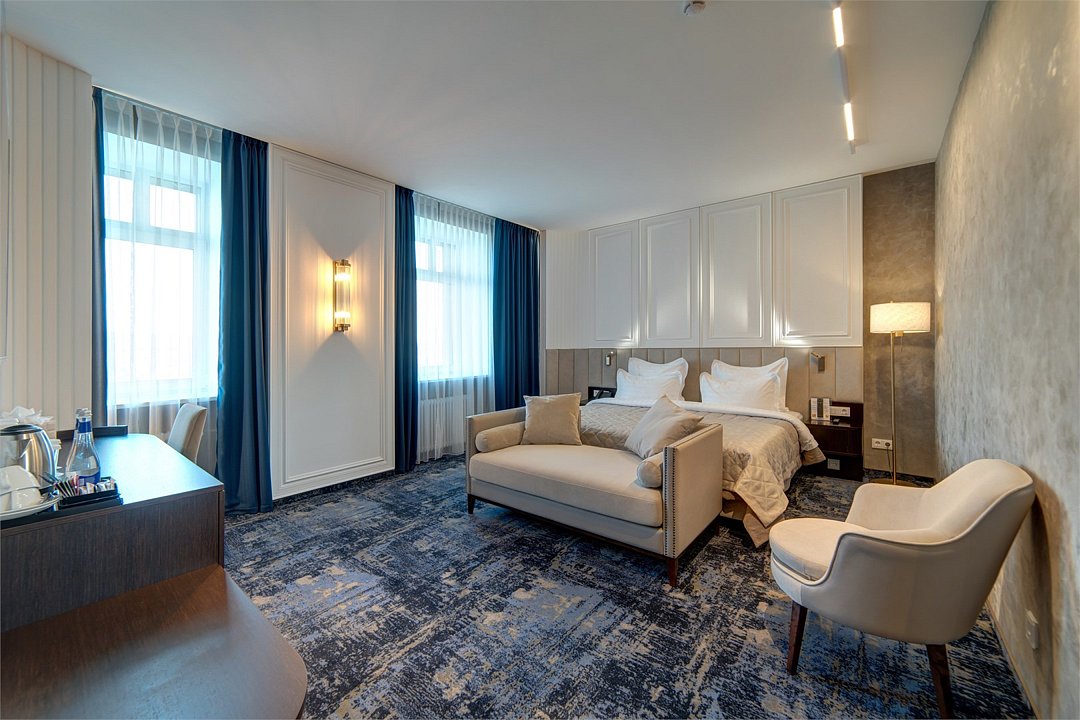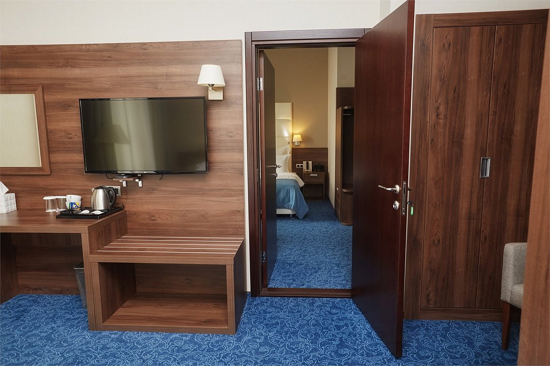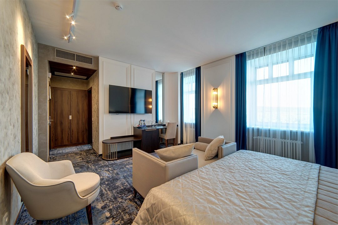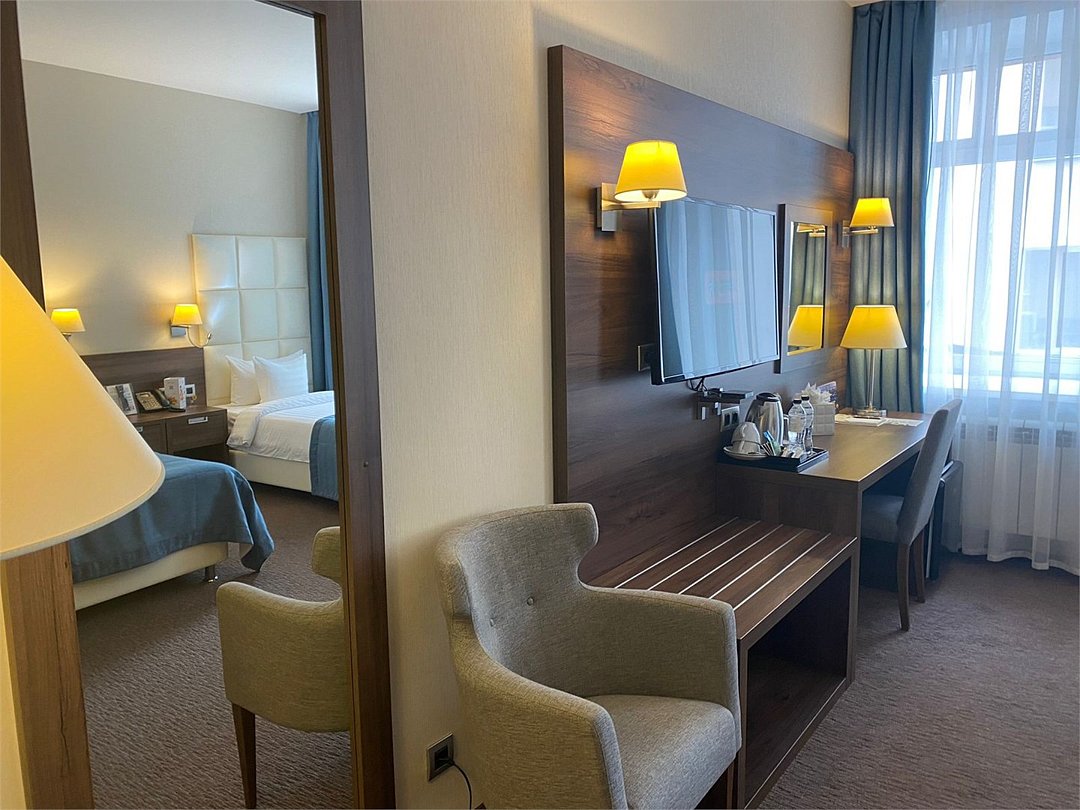 Просторный и комфортабельный двухкомнатный номер с видом на набережную. Пространство номера включает спальню и гостиную с обеденной зоной и уютной мягкой мебелью. В каждой комнате плазменная ТВ-панель. Предусмотрена гостевая туалетная комната.Услуги и удобства