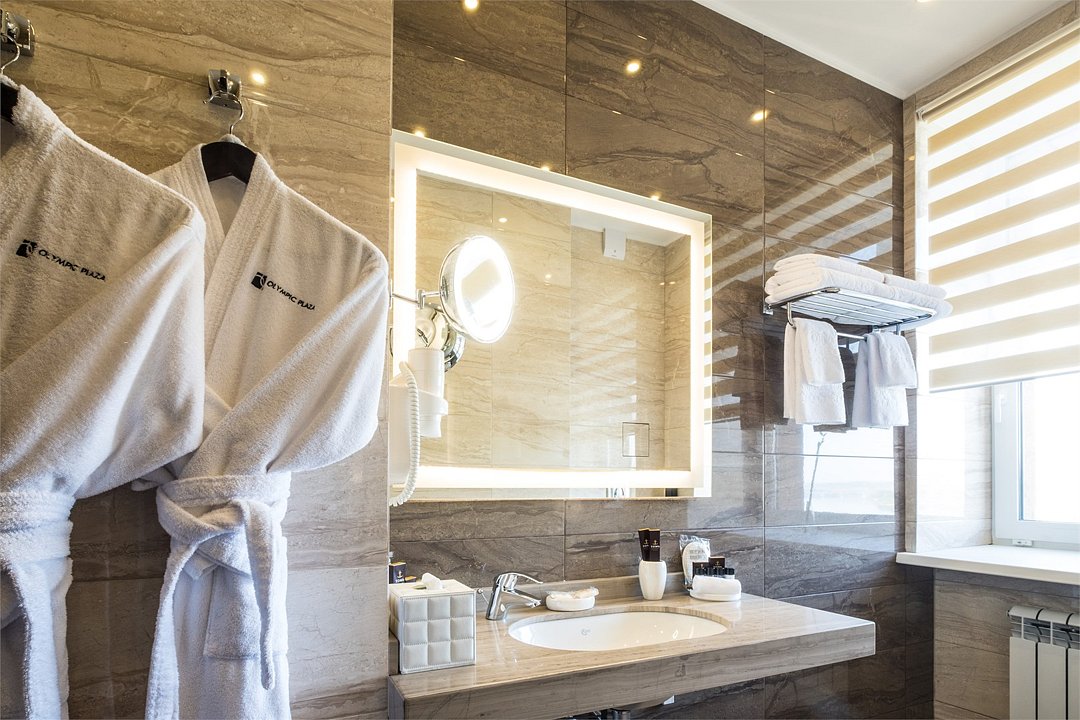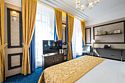 телевизор, спутниковое телевидение, подборка видео/аудио, Wi-Fi, телефон, кондиционер, светильник, настольные лампы, фен, система безопасности, электронные замки, утюг, душевая кабина, банные принадлежности, халаты, банные полотенца, тапочки, гигиенические средства, косметические средства, две односпальные или большая двуспальная кровать, гладильная доска, ортопедический матрас, тумбы, стулья, шкаф для одежды, вешалки, письменный стол, багажная тумба, зеркало, мини-бар, письменные принадлежности, свежая пресса, чайный набор, обслуживание номеров, информационная карта, меню, сейф, минеральная вода, чайник, унитаз, раковина, косметическое зеркало, питьевая вода, ковровое покрытие, вид на город, кулер на этаже, креслоВ номере