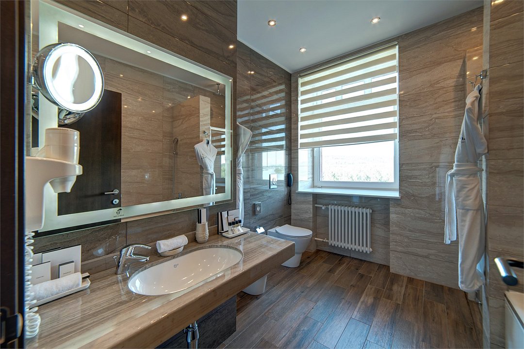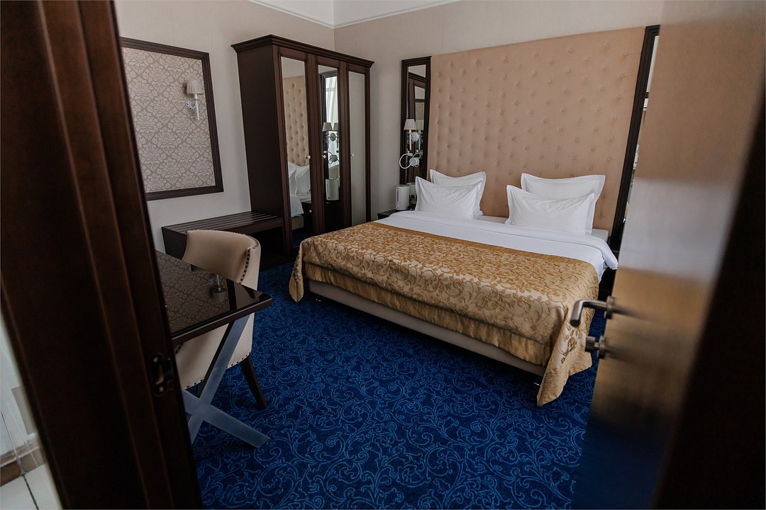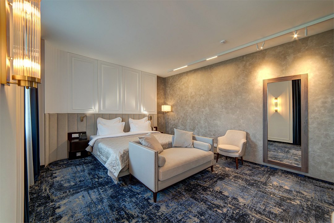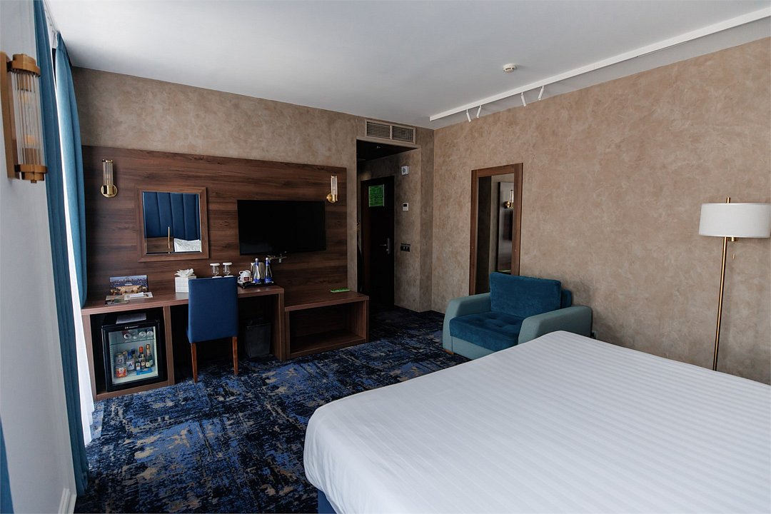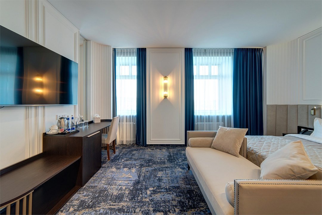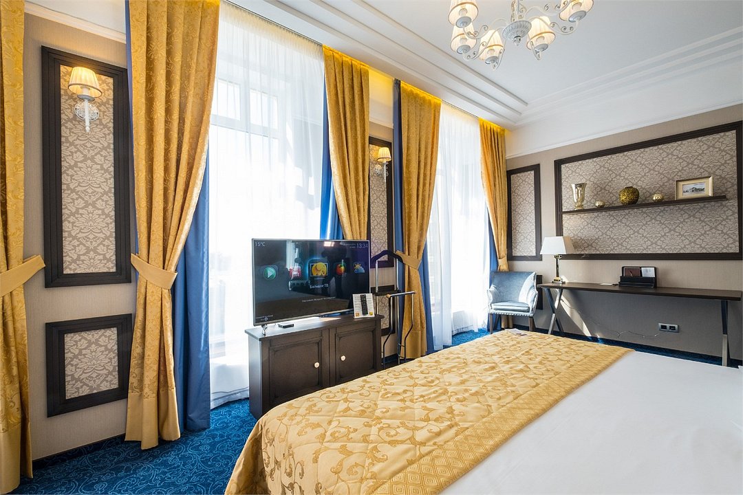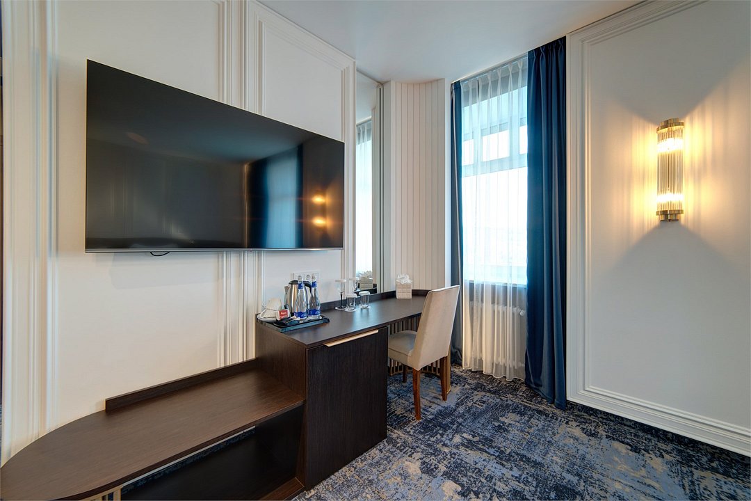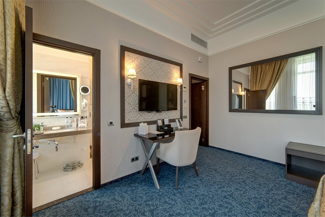 телевизор, интерактивное телевидение, подборка видео/аудио, Wi-Fi, телефон, кондиционер, светильник, настольные лампы, фен, система безопасности, электронные замки, утюг, ванная комната, душевая кабина, ванна, биде, теплый пол, банные принадлежности, халаты, банные полотенца, тапочки, гигиенические средства, косметические средства, балкон с красивым видом, кровать «King size», гладильная доска, тумбы, стулья, шкаф для одежды, вешалки, письменный стол, багажная тумба, зеркало, мини-бар, письменные принадлежности, свежая пресса, чайный набор, обслуживание номеров, информационная карта, меню, сейф, минеральная вода, чайник, унитаз, раковина, косметическое зеркало, питьевая вода, ковровое покрытие, отопление, кулер на этаже, вид на реку, креслоВ номере