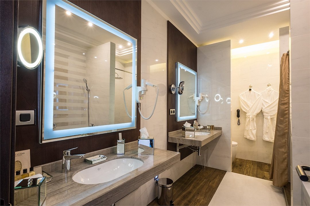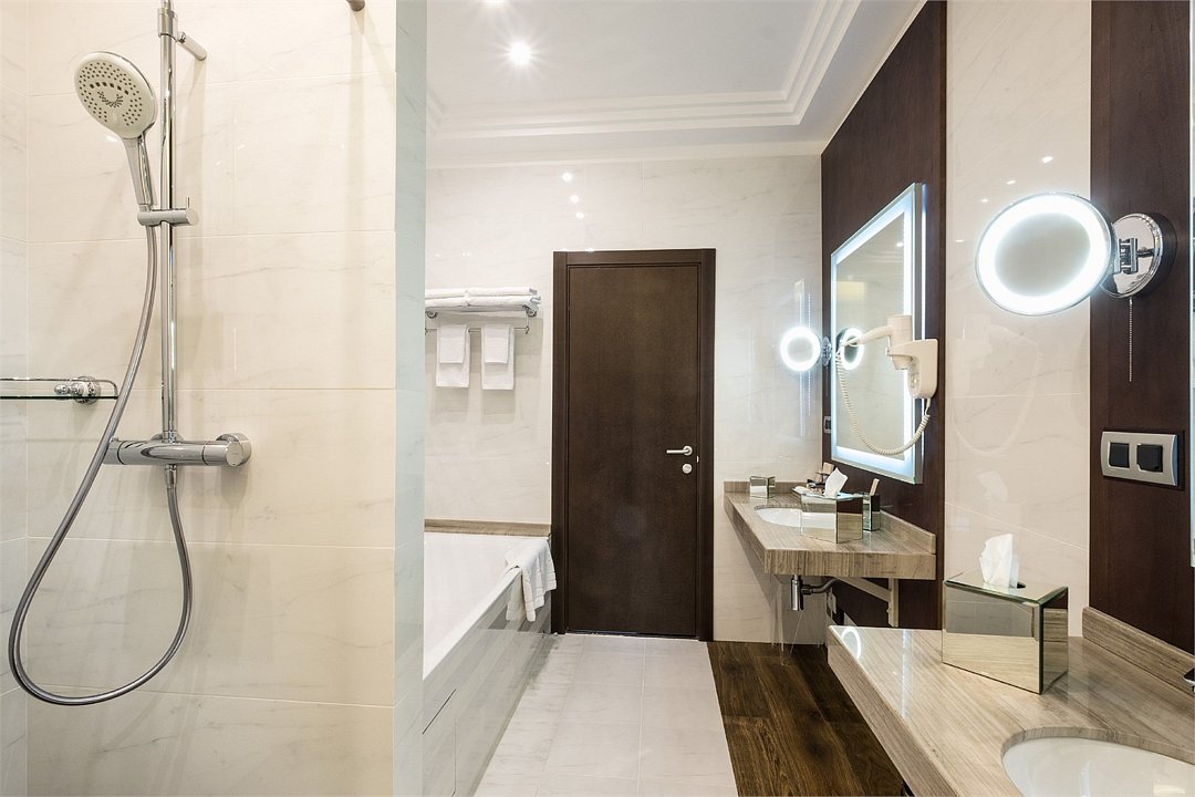 телевизор, два телевизора, спутниковое телевидение, подборка видео/аудио, Wi-Fi, телефон, кондиционер, система климат-контроля, светильник, настольные лампы, фен, система безопасности, электронные замки, утюг, душевая кабина, санузел, дополнительный санузел, теплый пол, банные принадлежности, халаты, банные полотенца, тапочки, косметические средства, две двуспальные кровати, гладильная доска, ортопедический матрас, тумбы, стулья, шкаф для одежды, вешалки, письменный стол, багажная тумба, зеркало, две комнаты, мини-бар, письменные принадлежности, чайный набор, обслуживание номеров, информационная карта, меню, сейф, минеральная вода, чайник, унитаз, раковина, косметическое зеркало, питьевая вода, ковровое покрытие, отопление, душ, вид на город, кулер на этаже, кресло, две спальни, вид во дворВ номере