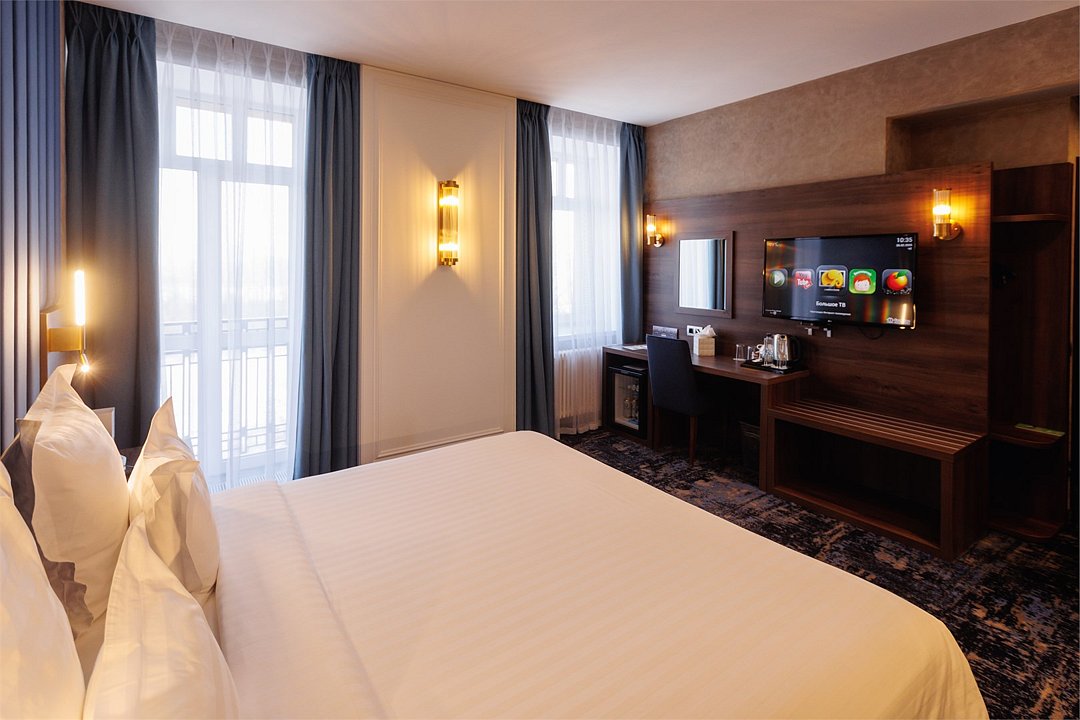 телевизор, интерактивное телевидение, подборка видео/аудио, Wi-Fi, телефон, кондиционер, светильник, настольные лампы, фен, система безопасности, электронные замки, утюг, ванная комната, душевая кабина, ванна, биде, теплый пол, банные принадлежности, халаты, банные полотенца, тапочки, гигиенические средства, косметические средства, балкон с красивым видом, кровать «King size», гладильная доска, тумбы, стулья, шкаф для одежды, вешалки, письменный стол, багажная тумба, зеркало, мини-бар, письменные принадлежности, свежая пресса, чайный набор, обслуживание номеров, информационная карта, меню, сейф, минеральная вода, чайник, унитаз, раковина, косметическое зеркало, питьевая вода, ковровое покрытие, отопление, кулер на этаже, вид на реку, кресло, без питомцевВ гостиничном номере