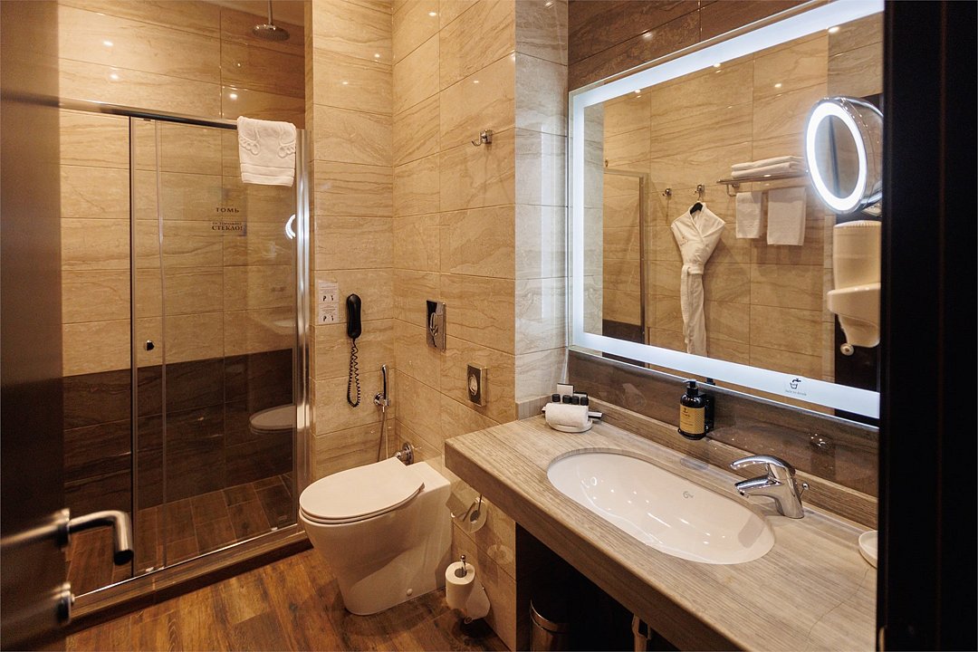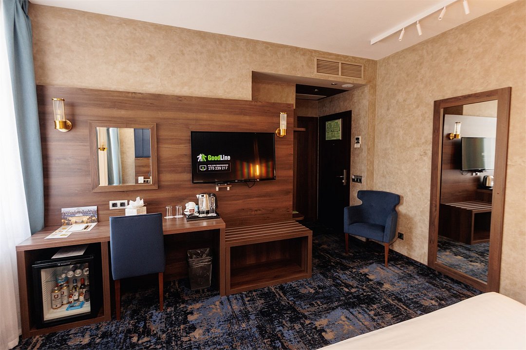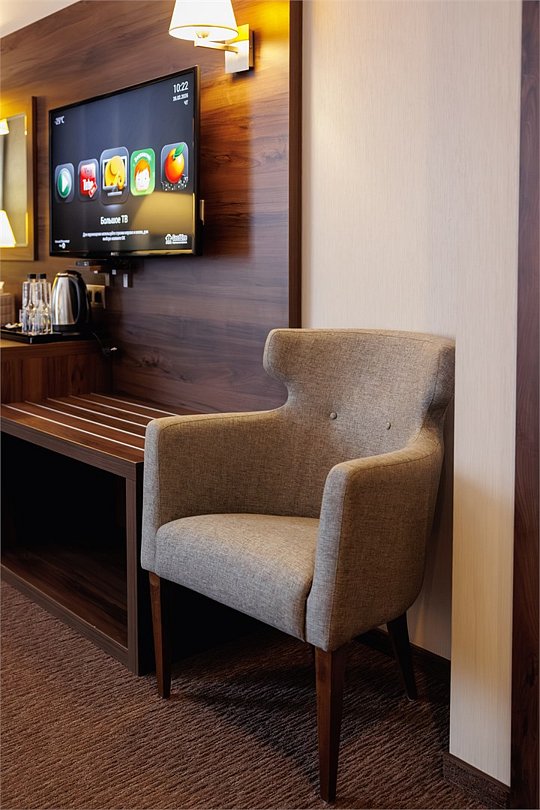 телевизор, спутниковое телевидение, подборка видео/аудио, Wi-Fi, телефон, кондиционер, светильник, настольные лампы, фен, система безопасности, электронные замки, утюг, душевая кабина, банные принадлежности, халаты, банные полотенца, тапочки, гигиенические средства, косметические средства, две односпальные или большая двуспальная кровать, гладильная доска, ортопедический матрас, тумбы, стулья, шкаф для одежды, вешалки, письменный стол, багажная тумба, зеркало, мини-бар, письменные принадлежности, свежая пресса, чайный набор, обслуживание номеров, информационная карта, меню, сейф, минеральная вода, чайник, унитаз, раковина, косметическое зеркало, питьевая вода, ковровое покрытие, вид на город, кулер на этаже, кресло, можно с питомцами, лежанка, миска, пакетик для выгула, пеленкаВ гостиничном номере