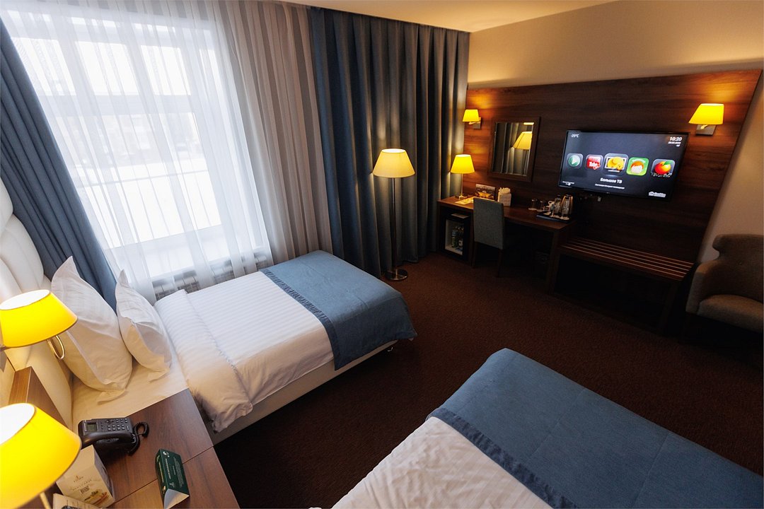 телевизор, спутниковое телевидение, подборка видео/аудио, Wi-Fi, телефон, кондиционер, светильник, настольные лампы, фен, электронные замки, утюг, душевая кабина, банные принадлежности, халаты, банные полотенца, тапочки, косметические средства, две односпальные кровати, гладильная доска, ортопедический матрас, шкаф для одежды, письменный стол, багажная тумба, письменные принадлежности, обслуживание номеров, сейф, минеральная вода, чайник, унитаз, питьевая вода, душ, вид на город, кулер на этаже, меню подушек, стул, чайная станция, уборка номера, набор для приготовления чая и кофе, услуги прачечной (платно), мини-бар (платно), можно с питомцами, лежанка, миска, пакетик для выгула, пеленкаВ гостиничном номере