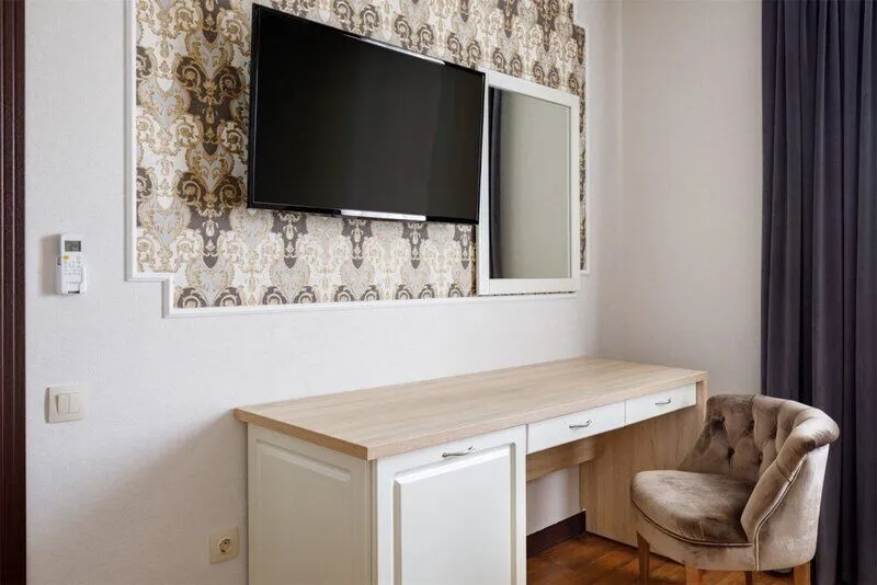 Wi-Fi, интернет, IP-телефон, кондиционер, настольные лампы, фен, электронные замки, санузел, халаты, косметические средства, кровать «King size», шкаф для одежды, письменный стол, багажная тумба, зеркало, ковер, мини-бар, чайный набор, обслуживание номеров, сейф, минеральная вода, чайник, душ, вид во двор, стаканы, стул, туалетные средства, цифровое тв, раскладной диван, внутренний телефон, телевизор с плоским экраном, гостиничная парфюмерия, без питомцевВ гостиничном номере