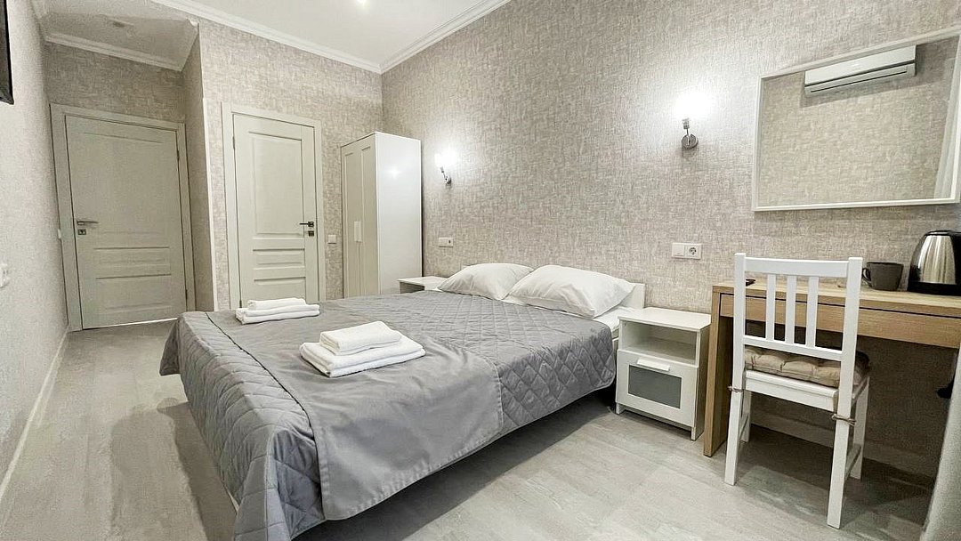 Уютный светлый номер для двоих с собственной ванной комнатой. В номере большая двуспальная кровать, ванная комната с душевой кабинкой, набор полотенец, минипарфюмерии, фен, кондиционер, телевизор, электрический чайник, холодильник. На территории отеля и в номерах предоставляется бесплатный доступ к WI-Fi.Услуги и удобства
