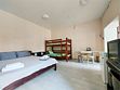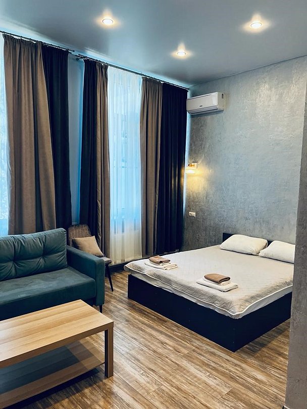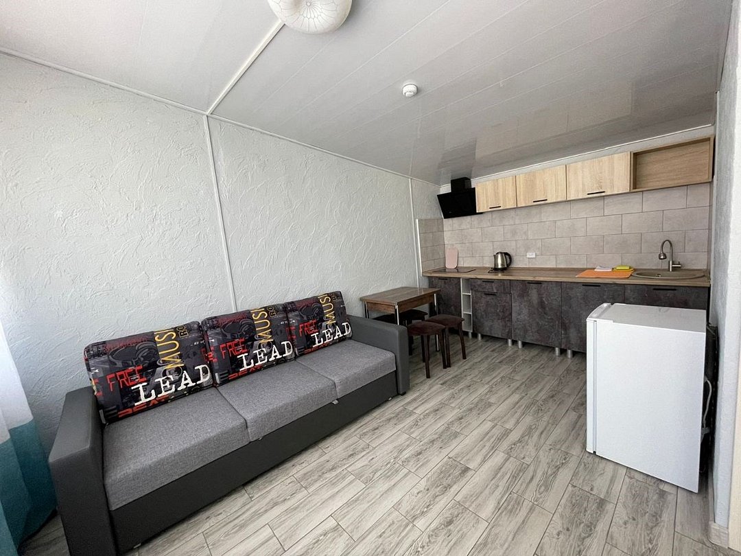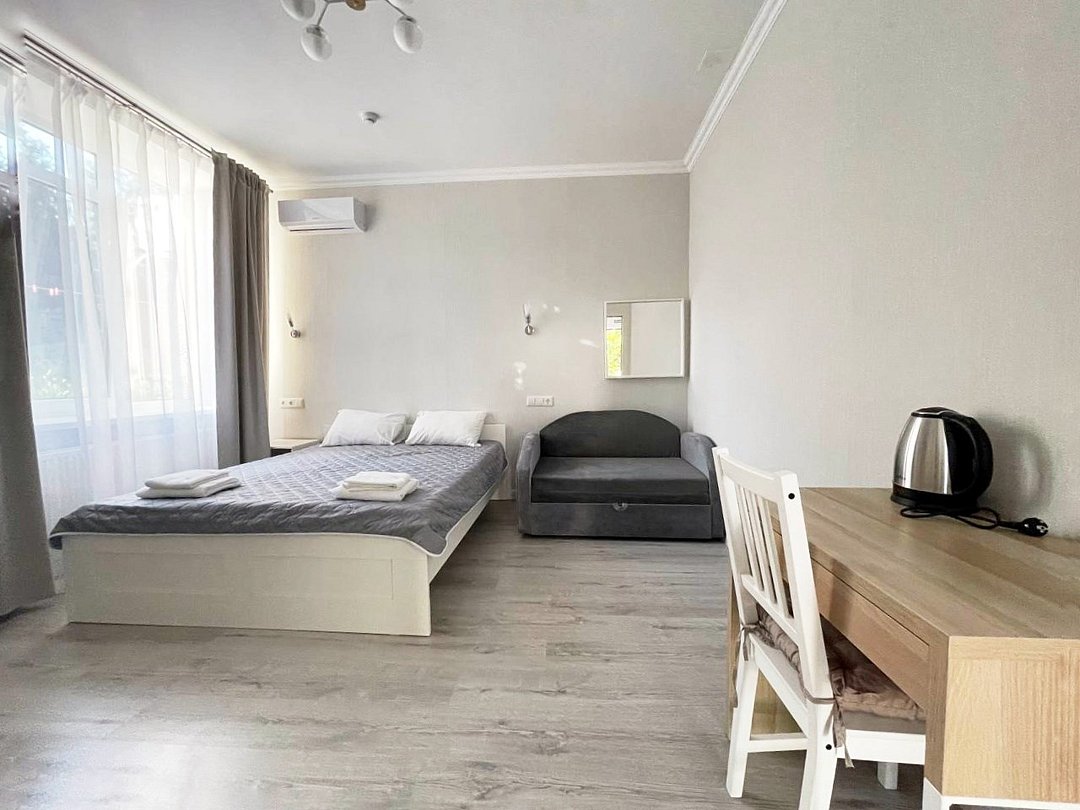 Просторные светлые номера-студии с отдельным входом и собственной оборудованной кухней со всем необходимым для самостоятельного приготовления. Большие окна наполняют каждое помещение светом и создают ощущение простора и легкости. В номере двухспальная кровать и двухспальный диван, ванная комната с душевой кабинкой, набор полотенец, мини парфюмерия, фен, кондиционер, телевизор, холодильник, электрический чайник. По запросу могут быть установлены дополнительное место в виде раскладушки либо детская кроватка для малыша. На территории отеля и в номерах предоставляется бесплатный доступ к WI-Fi. На крыльце садовая мебель для отдыха, где Вы можете собраться всей семёй на свежем воздухе.Услуги и удобства