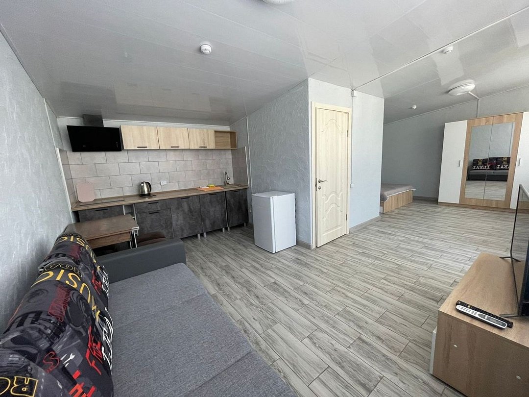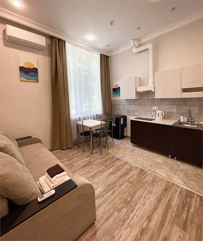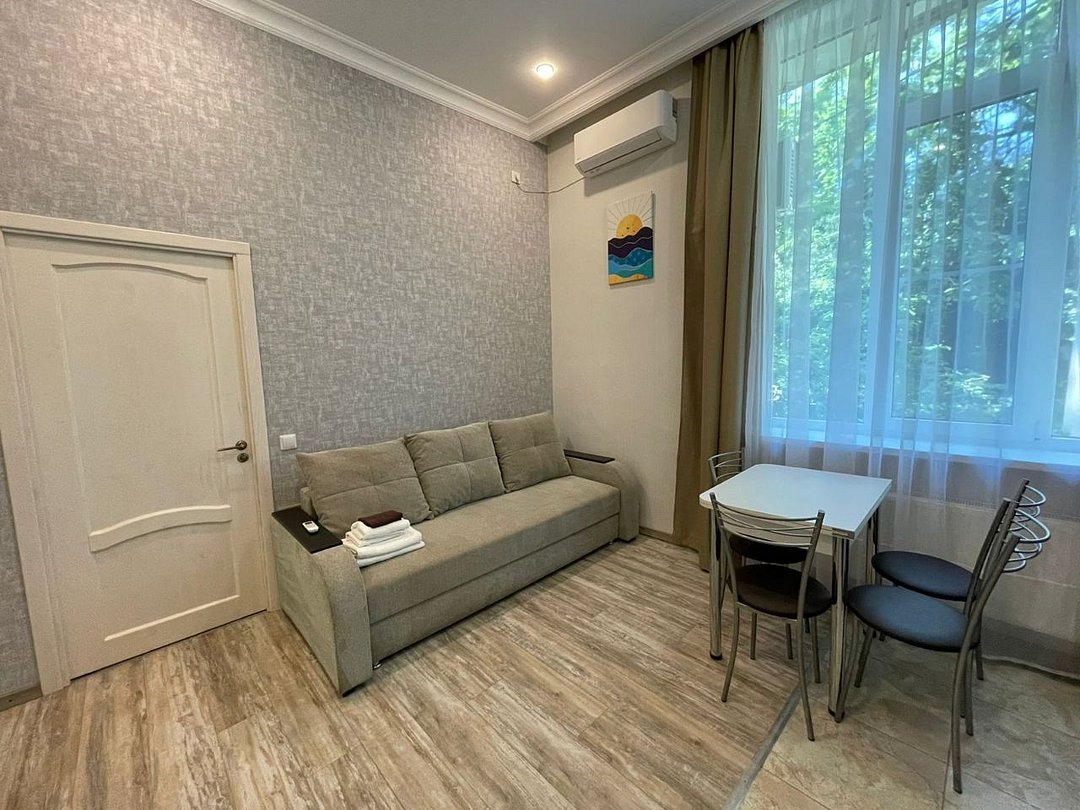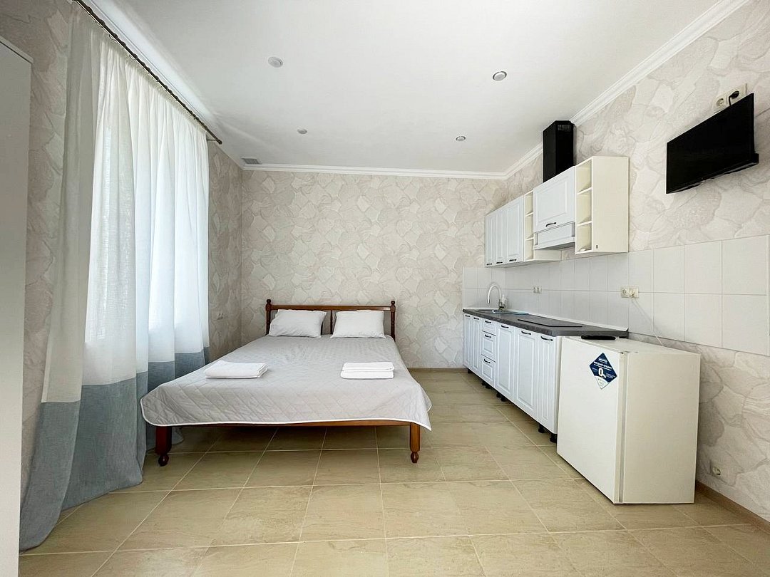 Светлая студя с собственной оборудованной кухней со всем необходимым для самостоятельного приготовления. В номере установлена большая двуспальная кровать, кондиционер, телевизор, холодильник. Ванная комната с душевой кабинкой, набором полотенец, минипарфюмерии, и феном. На территории отеля и в номерах предоставляется бесплатный доступ к WI-Fi. В номере отдельный вход, на крыльце садовая мебель: столик и кресла.Услуги и удобства