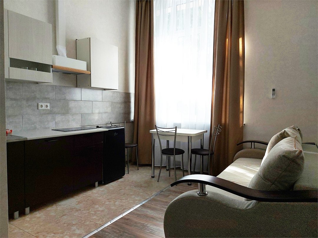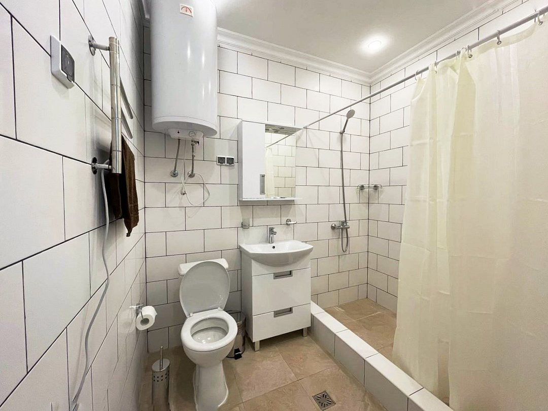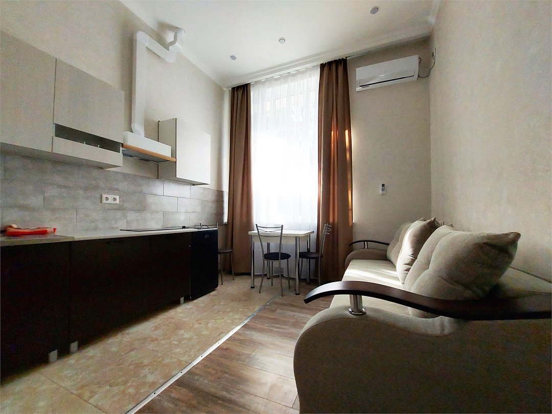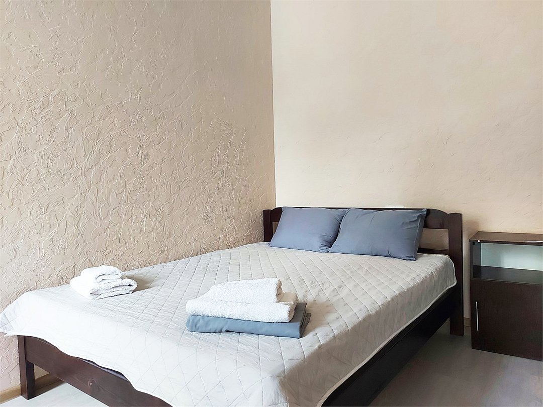 Светлая студя с собственной оборудованной кухней со всем необходимым для самостоятельного приготовления. В номере установлена большая двуспальная кровать, кондиционер, телевизор, холодильник. Ванная комната с душевой кабинкой, набором полотенец, минипарфюмерии, и феном. На территории отеля и в номерах предоставляется бесплатный доступ к WI-Fi. В номере отдельный вход, на крыльце садовая мебель: столик и кресла.Услуги и удобства