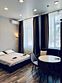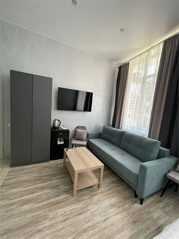 Двухкомнатный номер с кухней-гостинной со всем необходимым для самостоятельного приготовления и спальней. Большие окна наполняют каждое помещение светом и создают ощущение простора и легкости. В номере большая двухспальная кровать и двухспальный диван, ванная комната с душевой кабинкой, набор полотенец, мини парфюмерия, фен, кондиционер, телевизор, электрический чайник, холодильник. По запросу могут быть установлены дополнительное место в виде раскладушки либо детская кроватка для малыша. На территории отеля и в номерах предоставляется бесплатный доступ к WI-Fi.Услуги и удобства