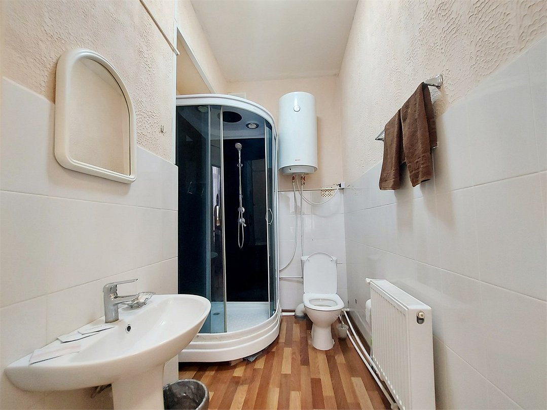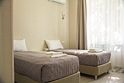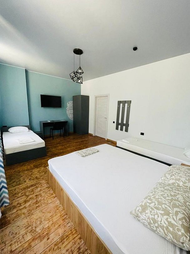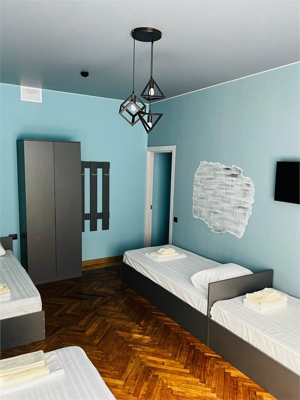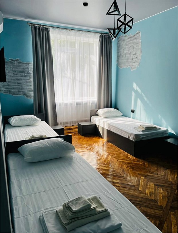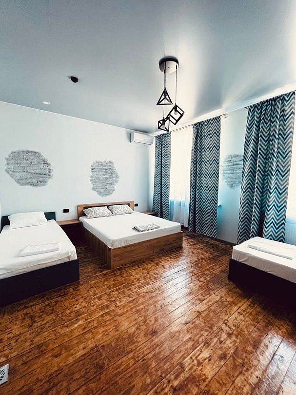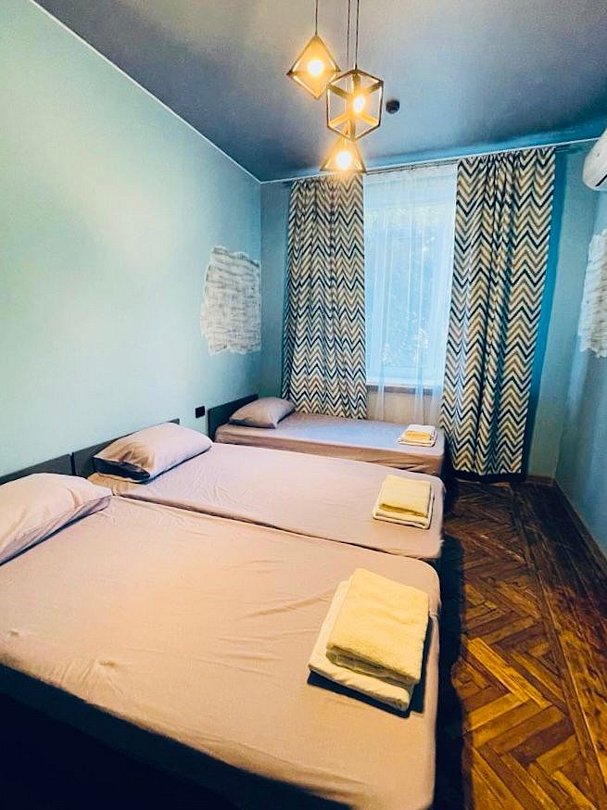 Уютный светлый однокомнатный номер для троих. В номере три односпальные кровати, по запросу две односпальные могут быть собраны в двуспальную. 3 общие ванные комнаты и 3 санузла. В номере есть кондиционер, телевизор. Предоставляются банные полотенца.Услуги и удобства