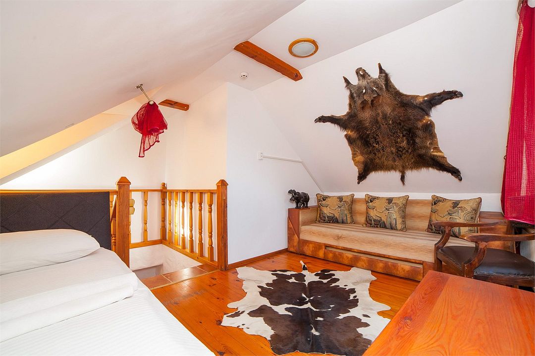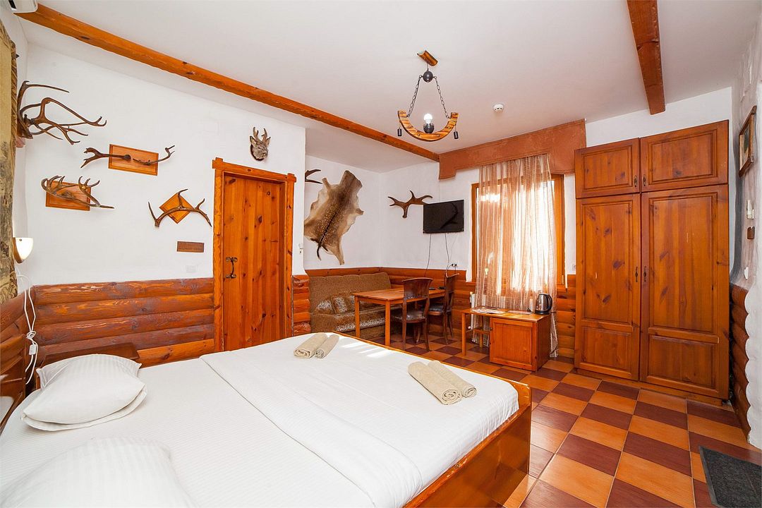 В этом люксе есть балкон, диван, собственная сауна за отдельную плату