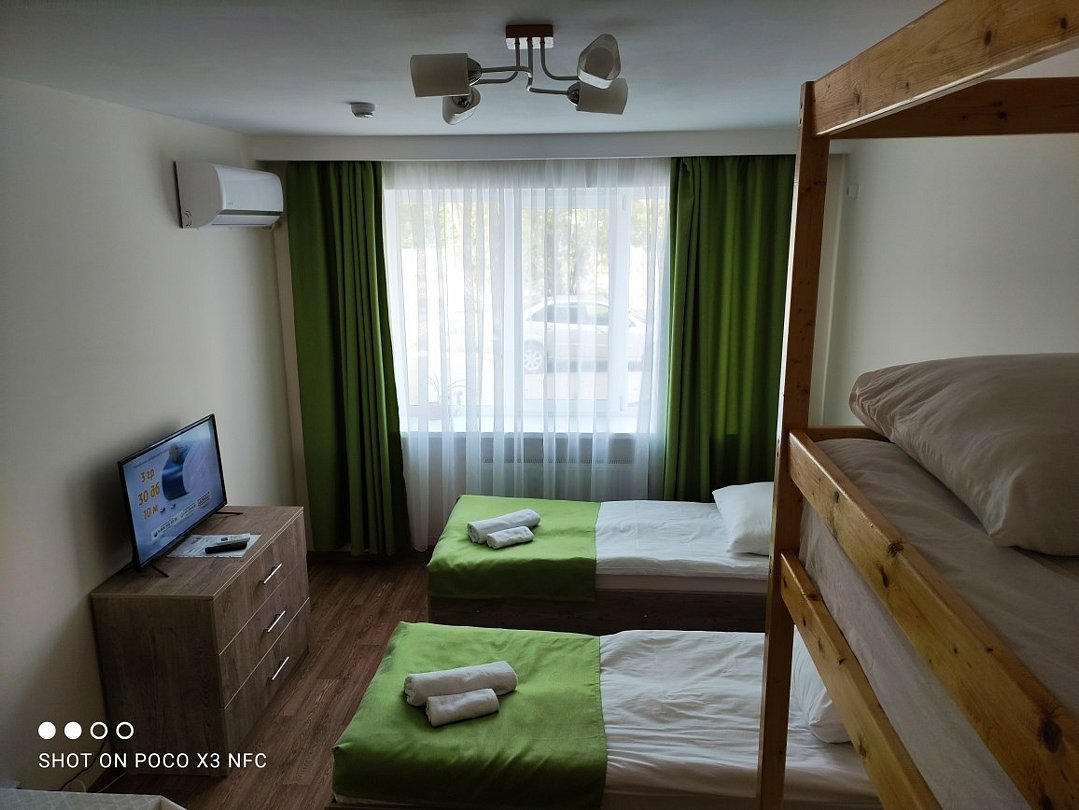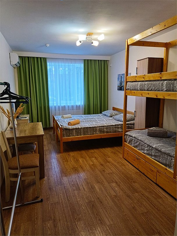 Четырехместный номер с 1 большой кроватью и двухярусной кроватью. Номер с кондиционером. В номере имеется санузел и душевая. Предоставляется: автостоянка, бесплатный wi-fi, , проживание с животными возможно по договоренности. Разрешается размещение детей любого возраста. Отдельно есть обеденная зона с большим удобным диваном и smart tv . Кухня общего пользования полностью укомплектованная посудой и техникой. Есть стиральная машинка для гостей.Услуги и удобства