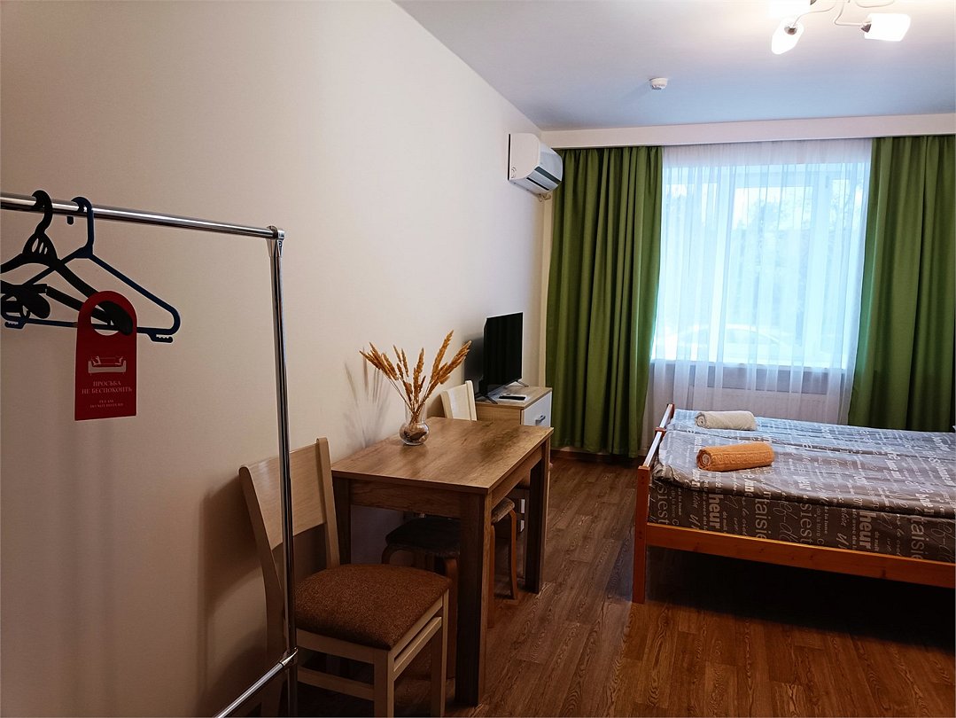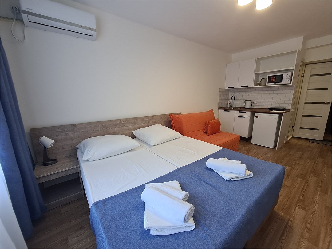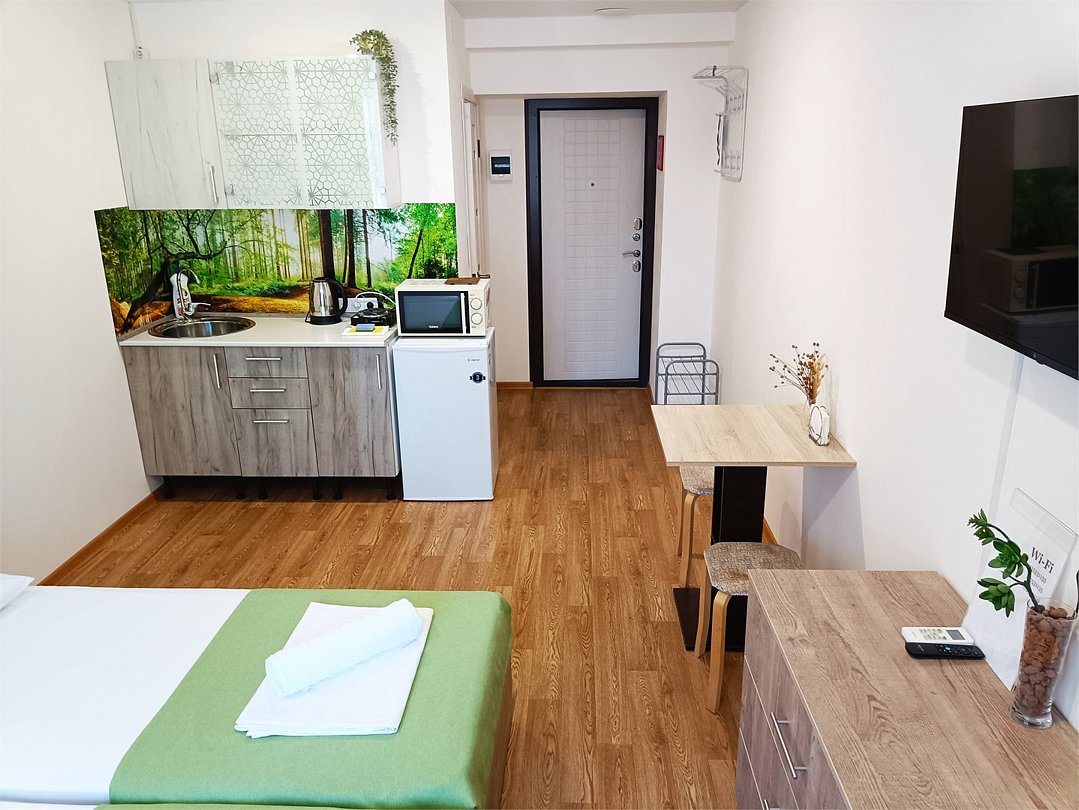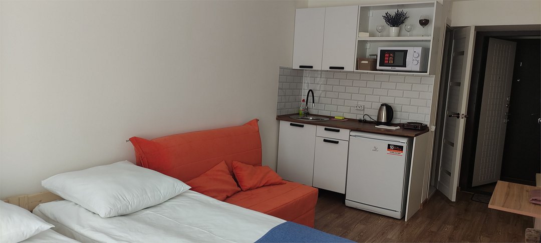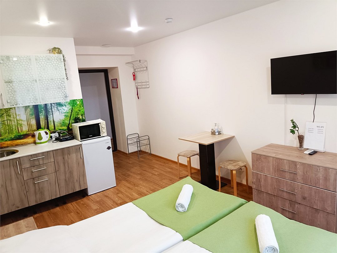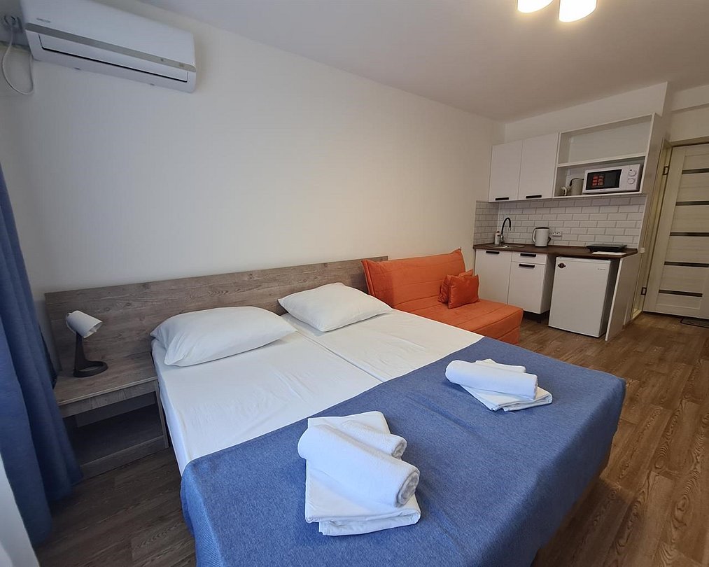 Двухместный номер с 1 кроватью или 2 отдельными кроватями и кондиционером. Номер оснащен мини кухней с печью СВЧ, электрическим чайником, холодильником и smart tv.В номере имеется санузел и душевая. Предоставляется: бесплатный wi-fi. Разрешается размещение детей любого возраста. Отдельно также есть обеденная зона с большим удобным диваном и smart tv . Кухня общего пользования полностью укомплектованная посудой и техникой. Есть стиральная машинка для гостей.Услуги и удобства