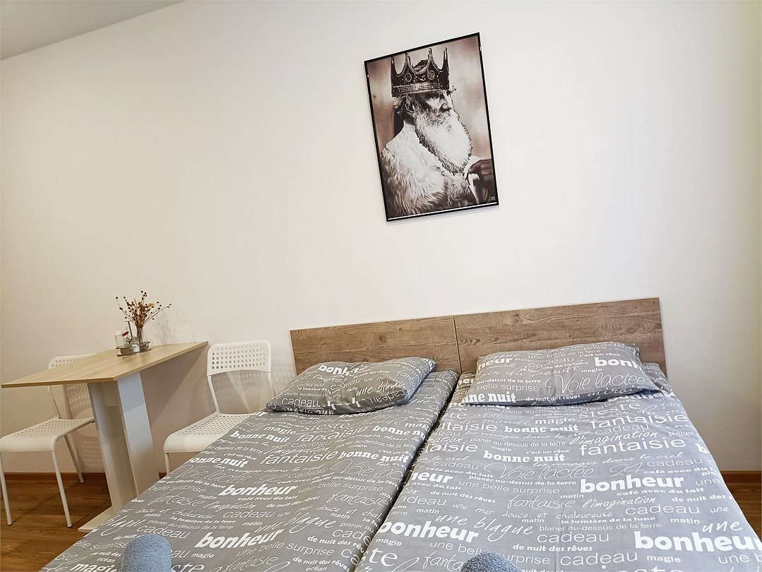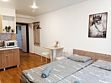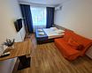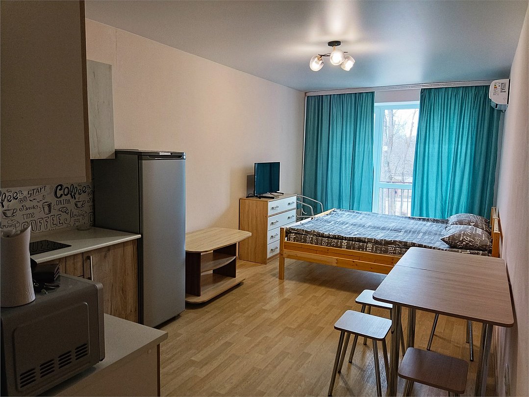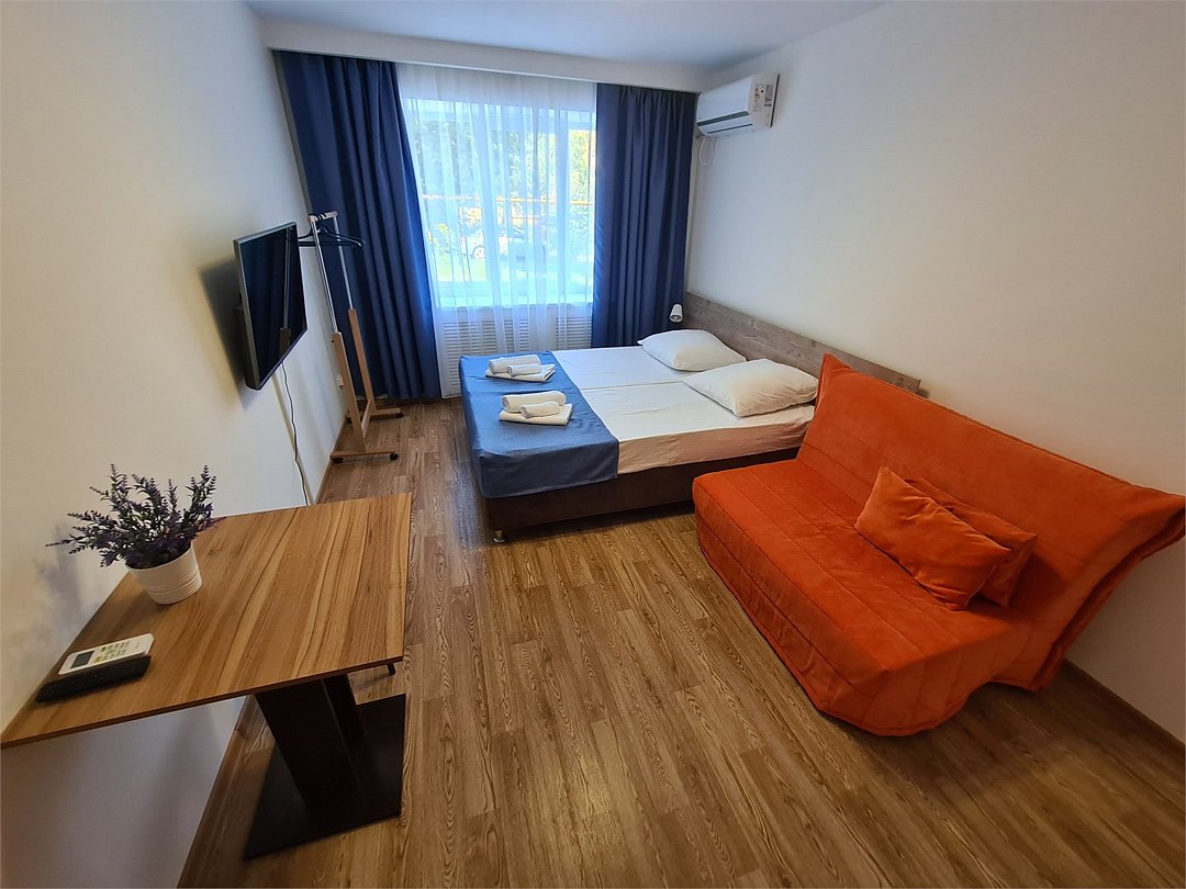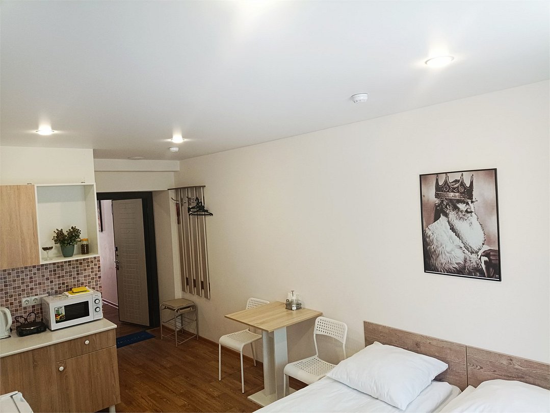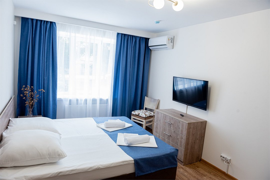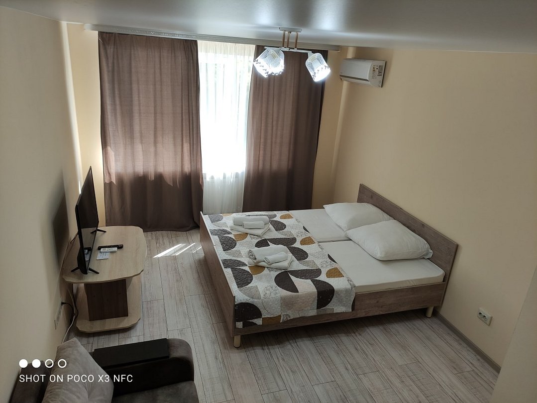 Двухместный номер с 1 кроватью или 2 отдельными кроватями и кондиционером. Номер оснащен мини кухней с печью СВЧ, электрическим чайником, холодильником и smart tv.В номере имеется санузел и душевая. Предоставляется: бесплатный wi-fi. Разрешается размещение детей любого возраста. Отдельно также есть обеденная зона с большим удобным диваном и smart tv . Кухня общего пользования полностью укомплектованная посудой и техникой. Есть стиральная машинка для гостей.Услуги и удобства