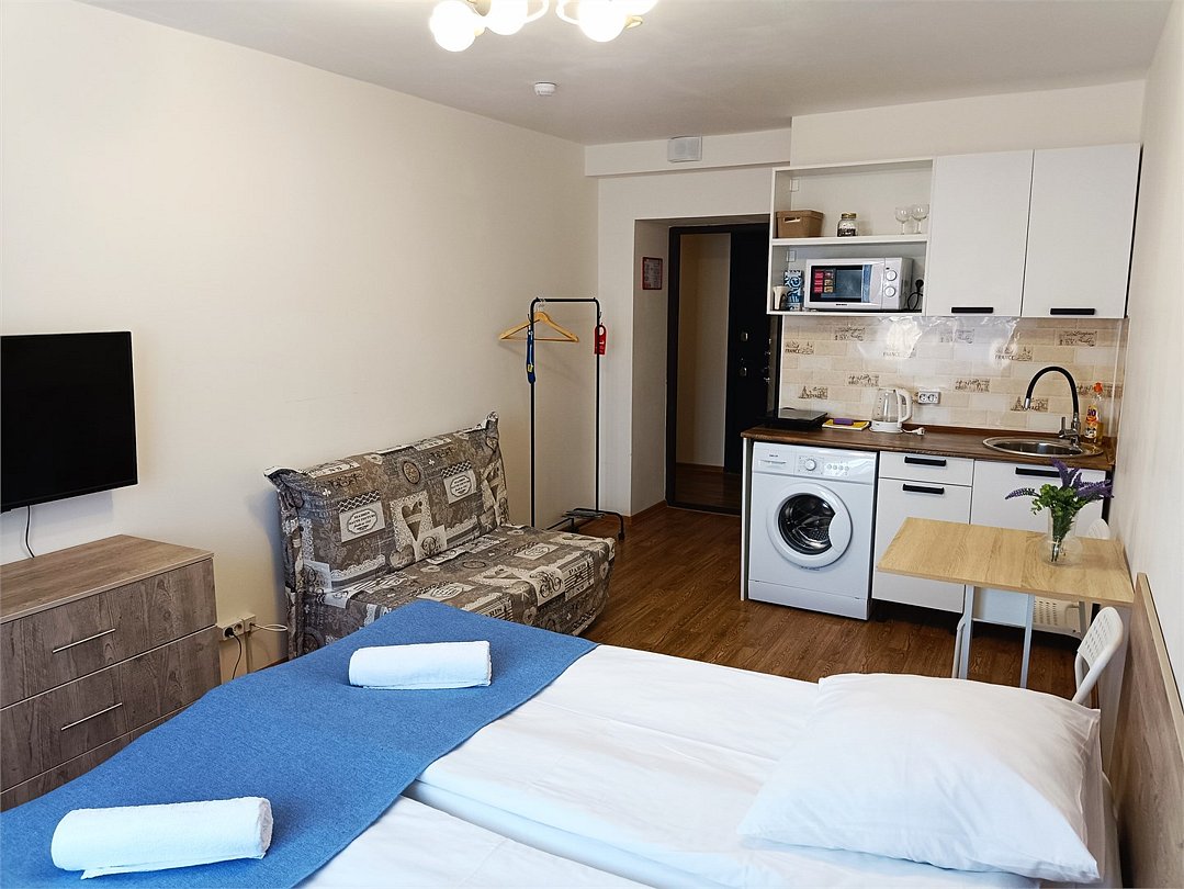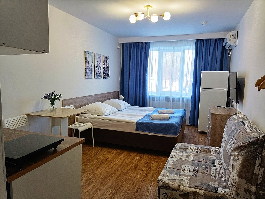 Wi-Fi, холодильник, ванна, санузел, две полутораспальные кровати, стулья, стол, туалет, сплит-система, диван-кровать, шкаф-купе, телевизор со Smart TV, духовой шкафВ апартаментах