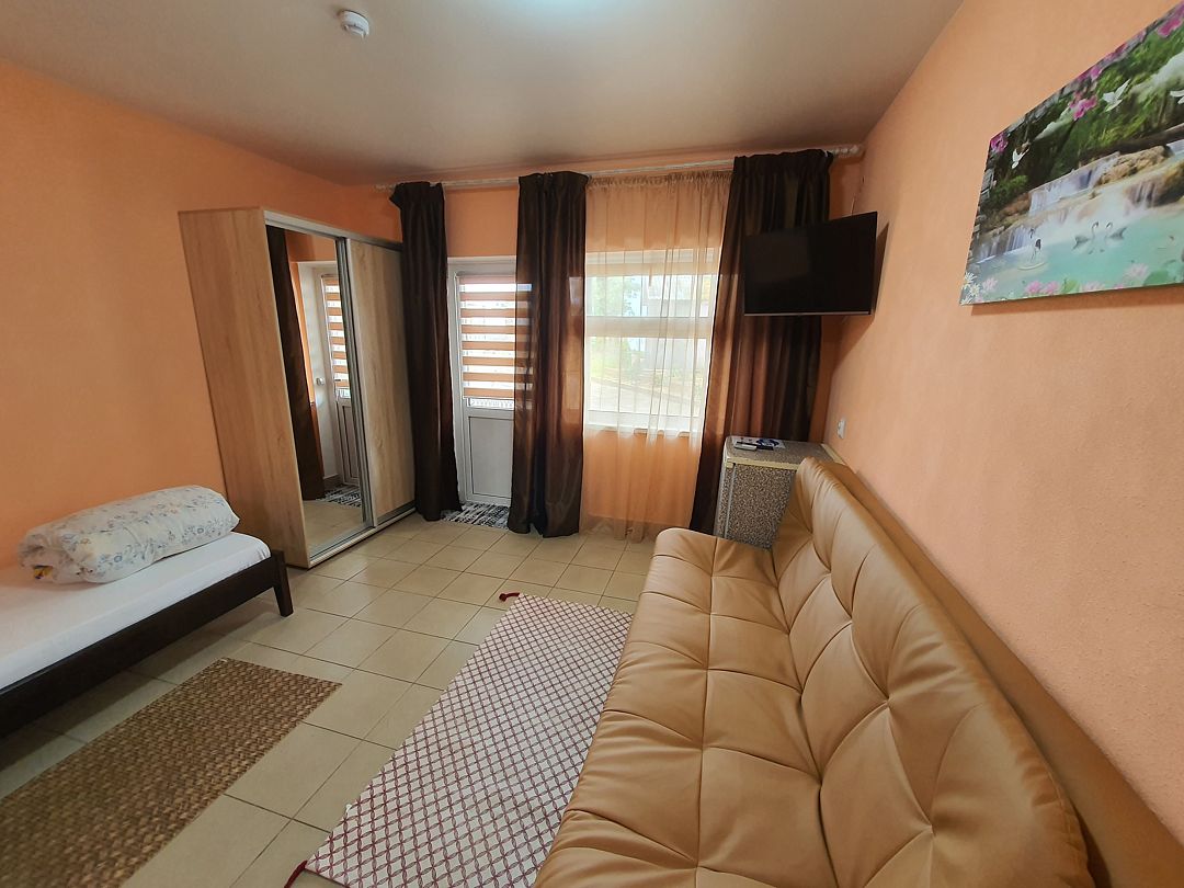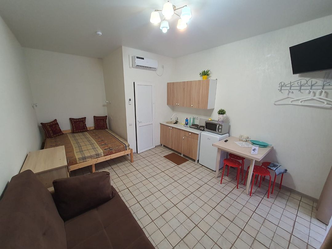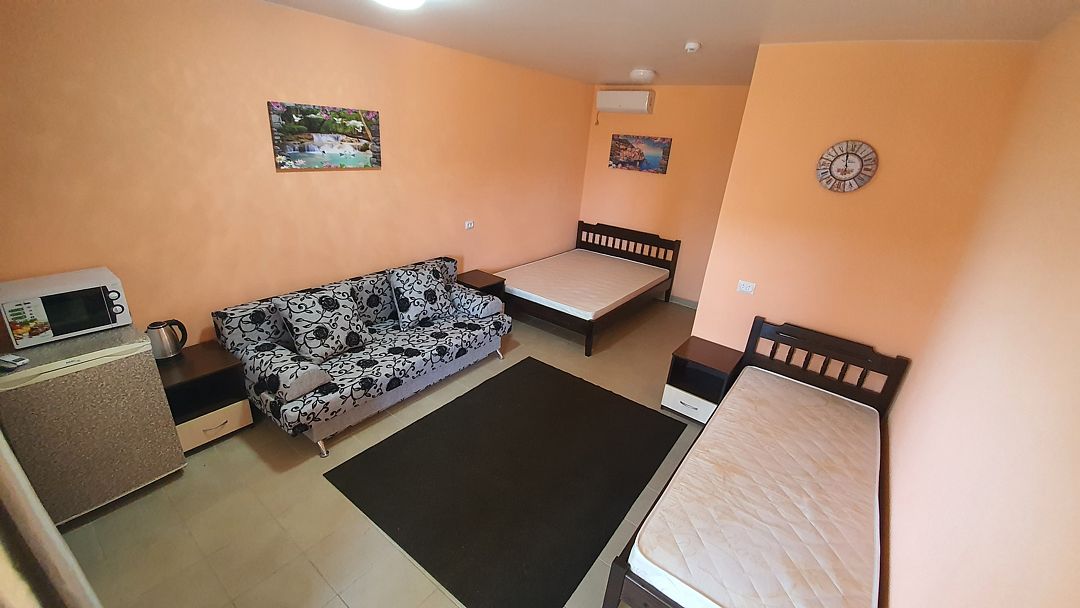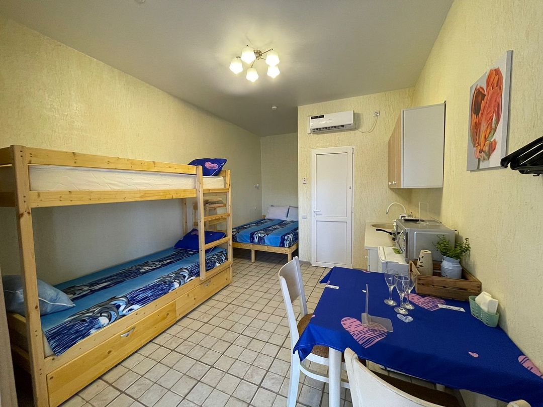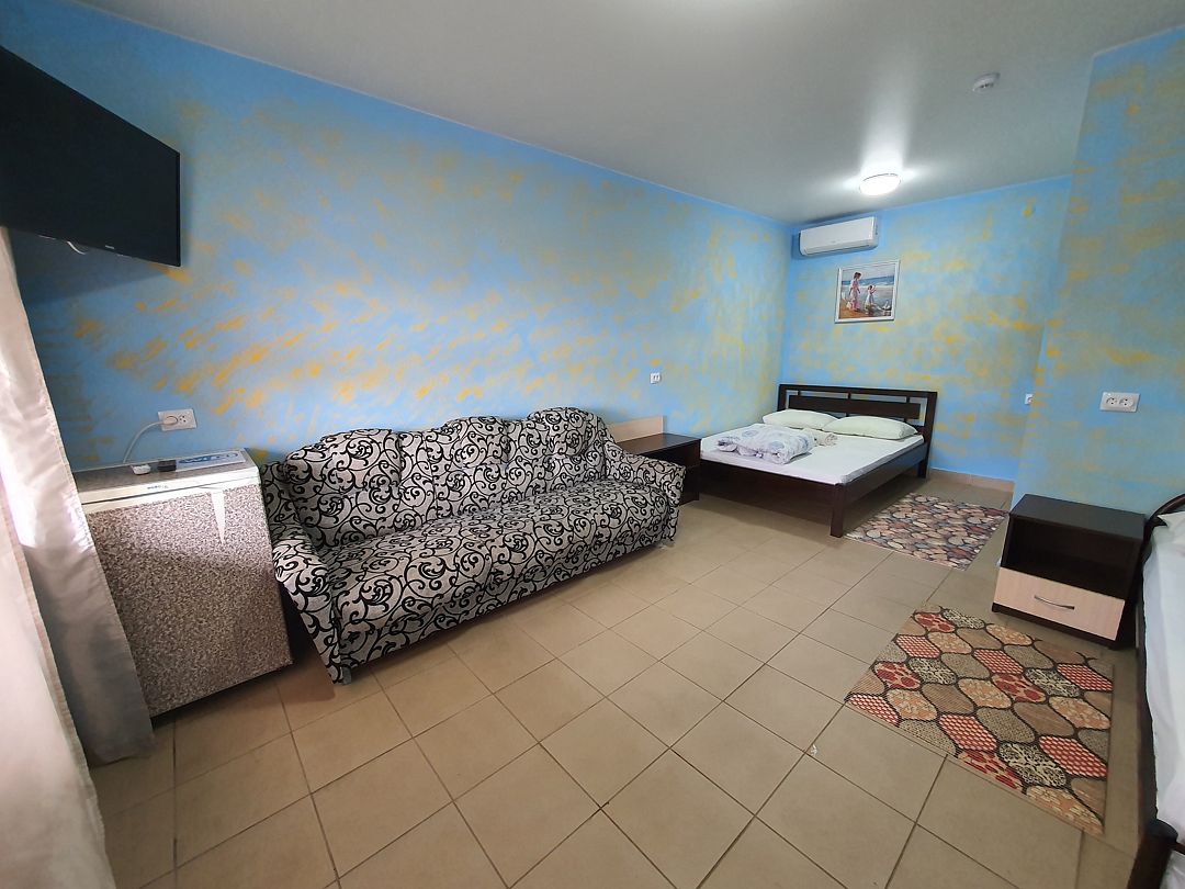 Просторный и уютный семейный номер идеально подходит для комфортного проживания семей с детьми. В номере есть всё необходимое для приятного отдыха и полноценного проживания. Описание номера: • Площадь: 20 кв. м. • Вместимость: до 4 человек. • Мебель: двуспальная кровать, диван-кровать, шкаф для одежды, письменный стол, стулья. • Техника: телевизор, холодильник, плита, микроволновая печь, чайник. • Ванная комната: душ, туалет, раковина, полотенца, косметические принадлежности. • Кухня: оборудована всем необходимым для приготовления пищи. • Терраса: просторная терраса с видом на море, где можно насладиться свежим воздухом и красивым видом. Семейный номер — это отличный выбор для тех, кто ценит комфорт и уют. Здесь вы сможете отдохнуть после насыщенного дня, приготовить любимые блюда и провести время в кругу семьи.