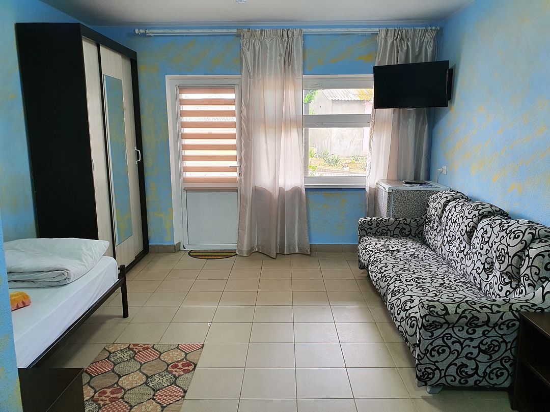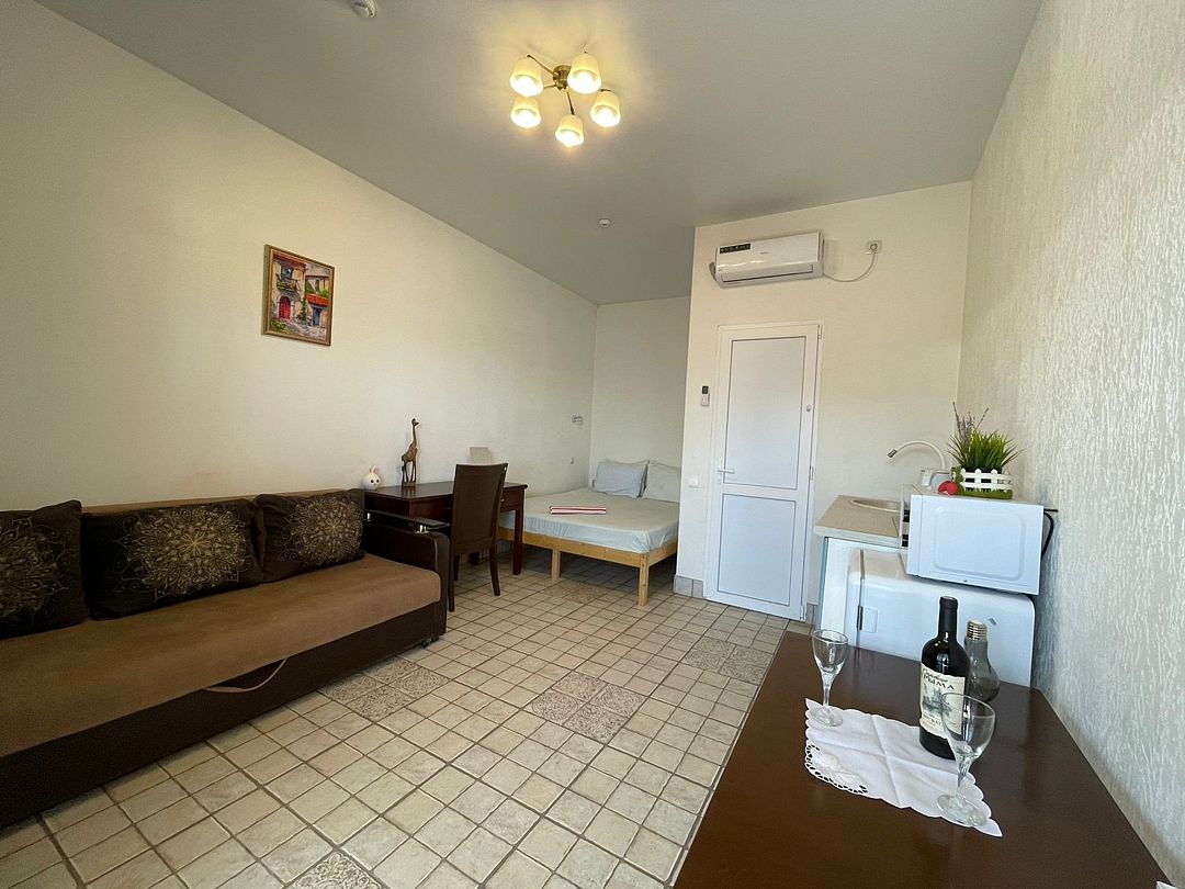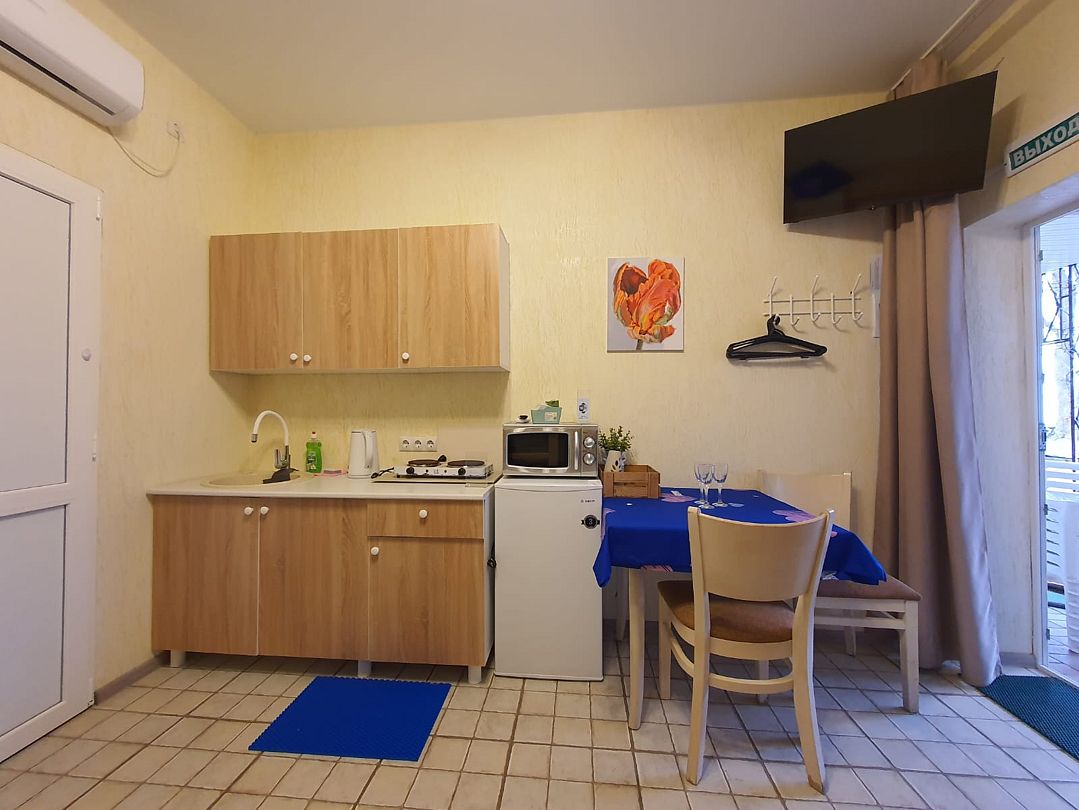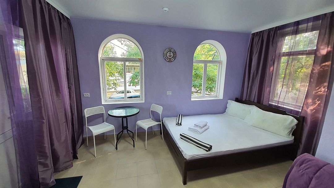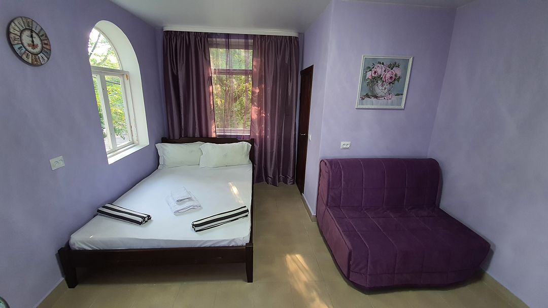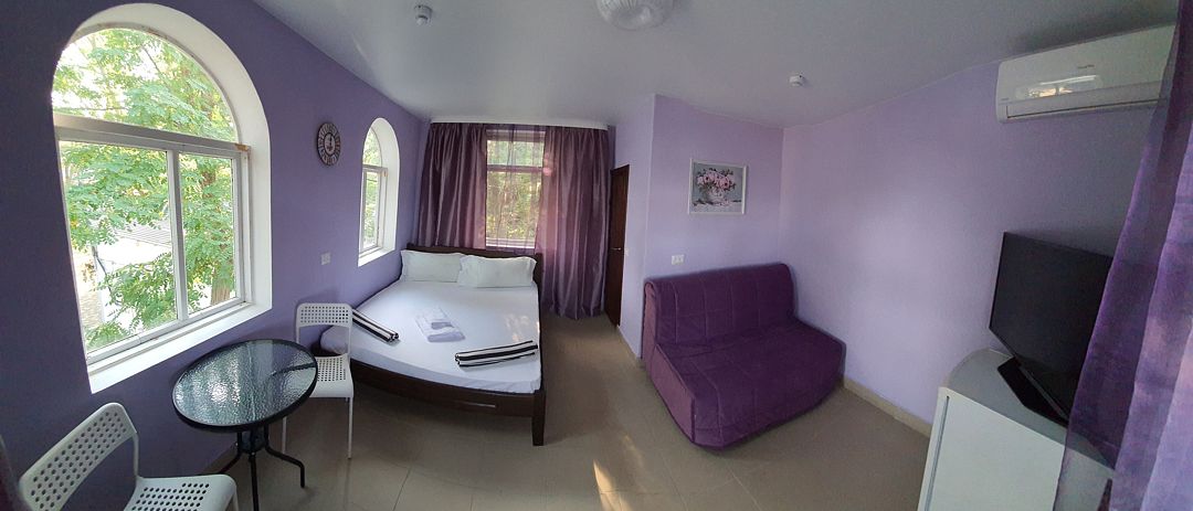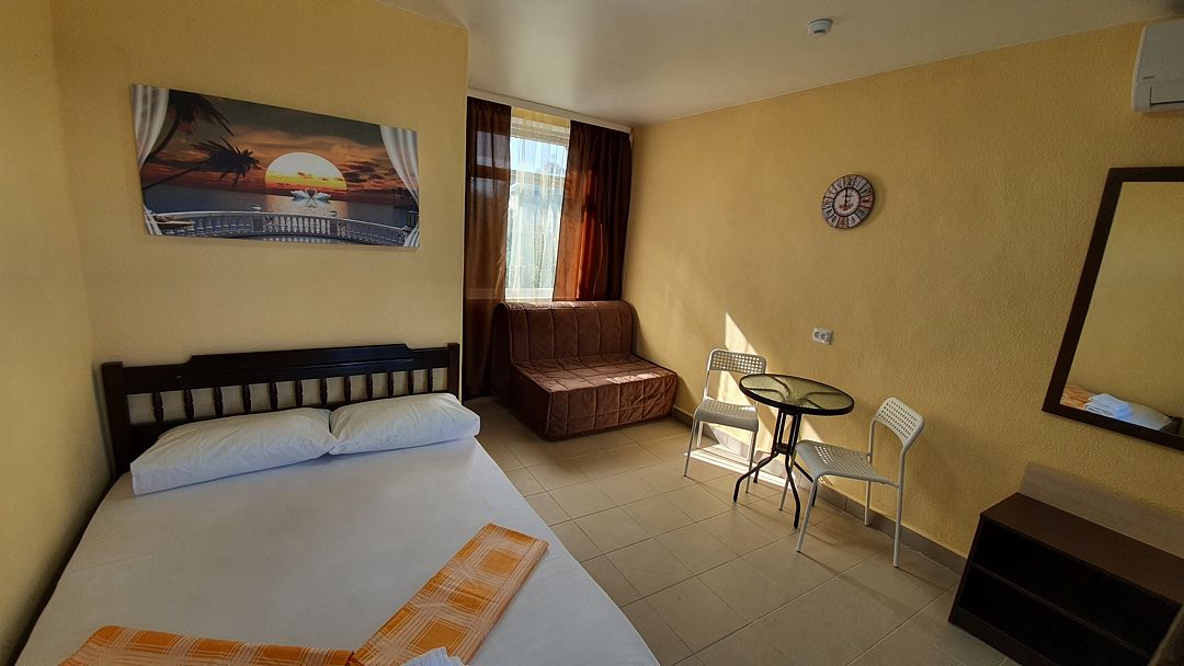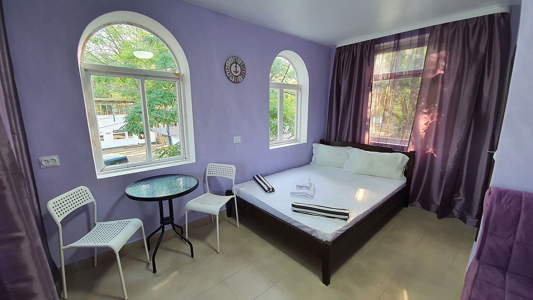 Уютный, светлый однокомнатный номер, площадью 18 кв.м. расположен на 2м этаже с красивым видом на море и Крымский мост. Номер содержит все необходимое для комфортного проживания и отдыха: ванной комнатой, шкафом для одежды, мини холодильником, LCD телевизором, кондиционером, бесплатным доступом к сети Интернет (WiFi), феном, электрочайником. Одним из достоинств этого номера являются большой просторный балкон с летней мебелью, что позволит отдыхать на свежем воздухе и любоваться красивым видом на море и корабли. Это отличный вариант для молодой пары или не большой семьи.