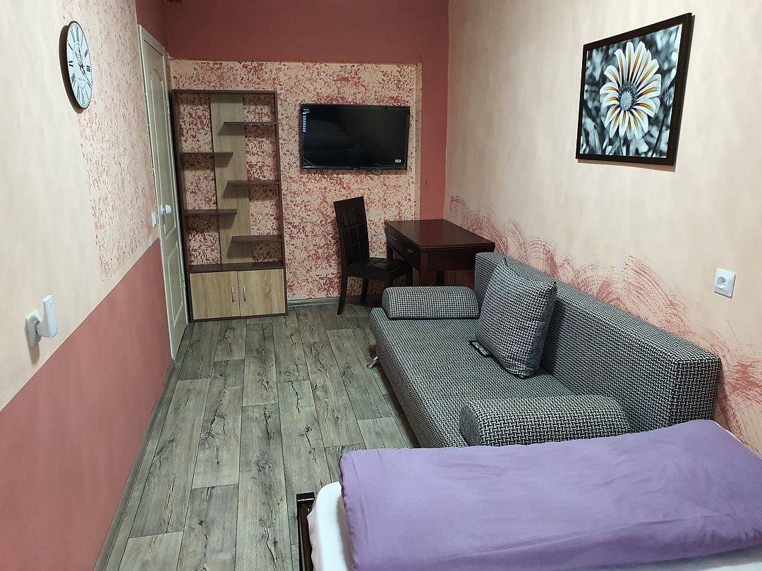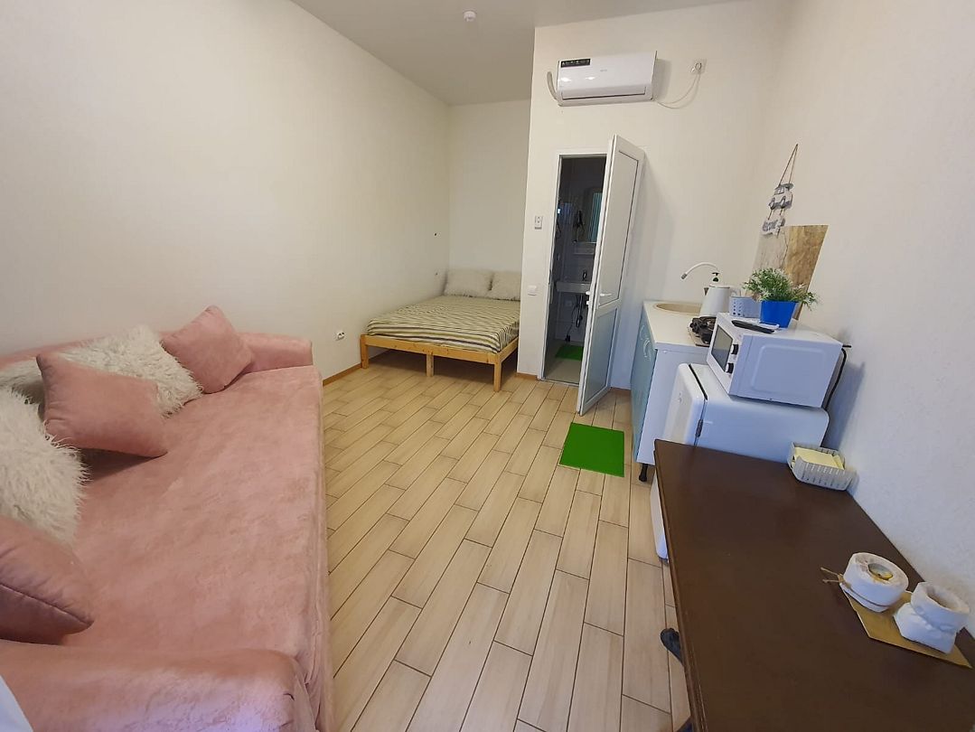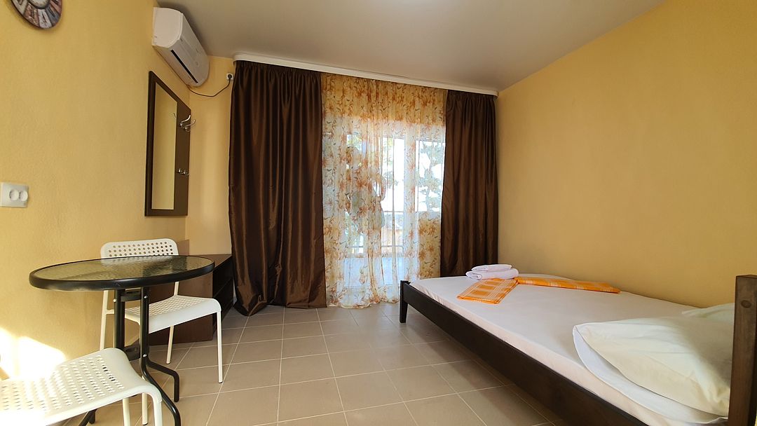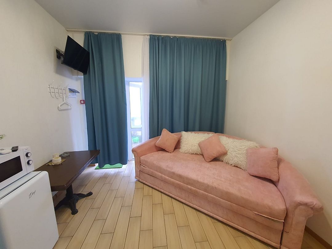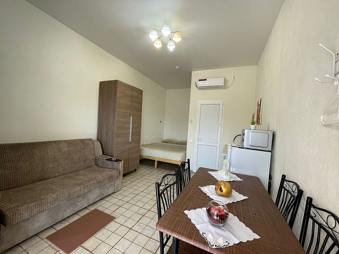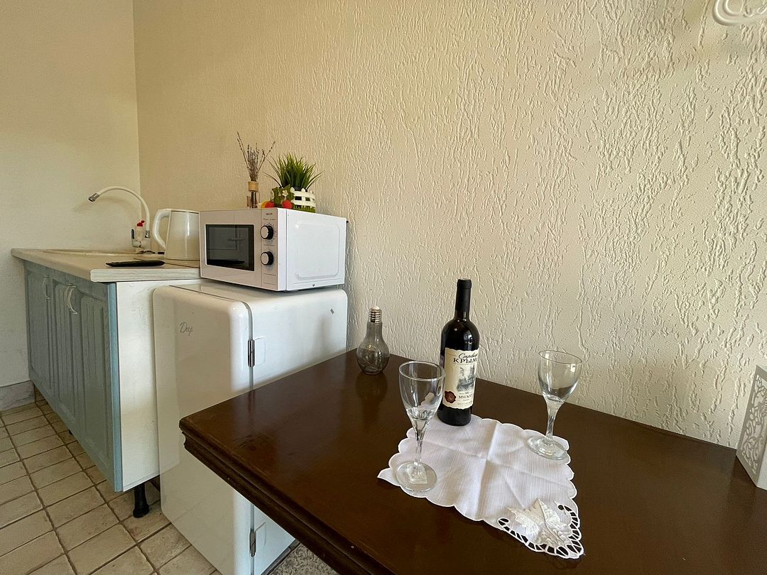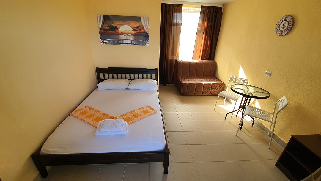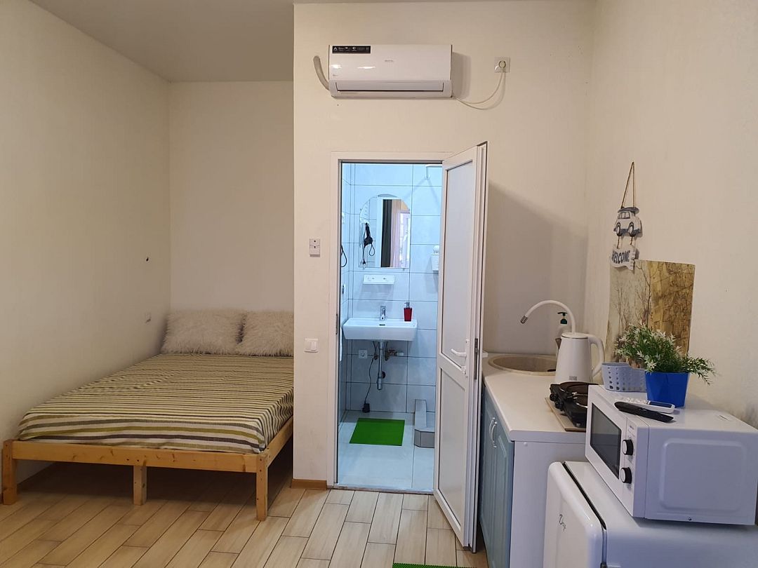 Уютный, светлый однокомнатный номер, площадью 18 кв.м. расположен на 2м этаже с красивым видом на море и Крымский мост. Номер содержит все необходимое для комфортного проживания и отдыха: ванной комнатой, шкафом для одежды, мини холодильником, LCD телевизором, кондиционером, бесплатным доступом к сети Интернет (WiFi), феном, электрочайником. Одним из достоинств этого номера являются большой просторный балкон с летней мебелью, что позволит отдыхать на свежем воздухе и любоваться красивым видом на море и корабли. Это отличный вариант для молодой пары или не большой семьи.
