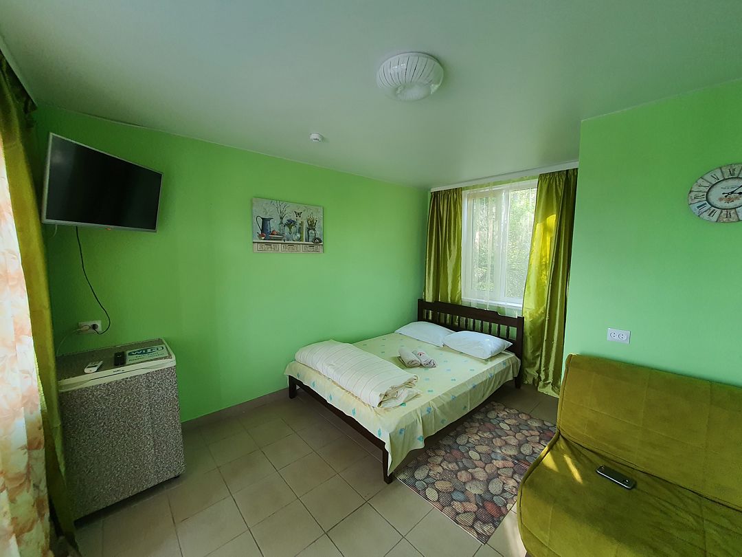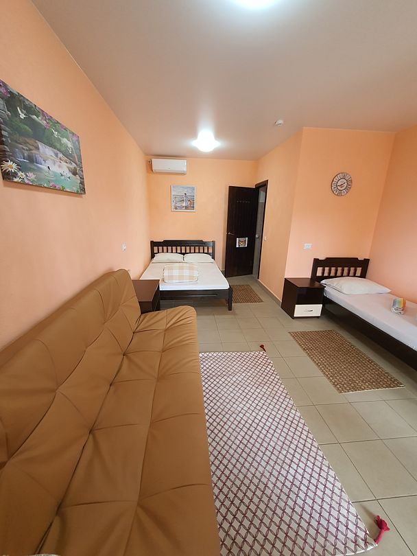 Просторный номер площадью 25 кв.м. рассчитан на комфортный отдых для семьи из 5 человек. Номер оснащен всем необходимым для комфортного отдыха: ванной комнатой, шкафом для одежды, мини холодильником, LCD телевизором, кондиционером, бесплатным доступом к сети Интернет (WiFi), феном, электрочайником. Отличное соотношение цена – качество позволит вам за относительно небольшие деньги получить максимум комфорта и удобств.