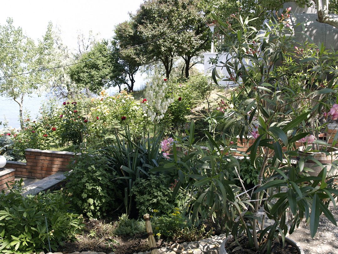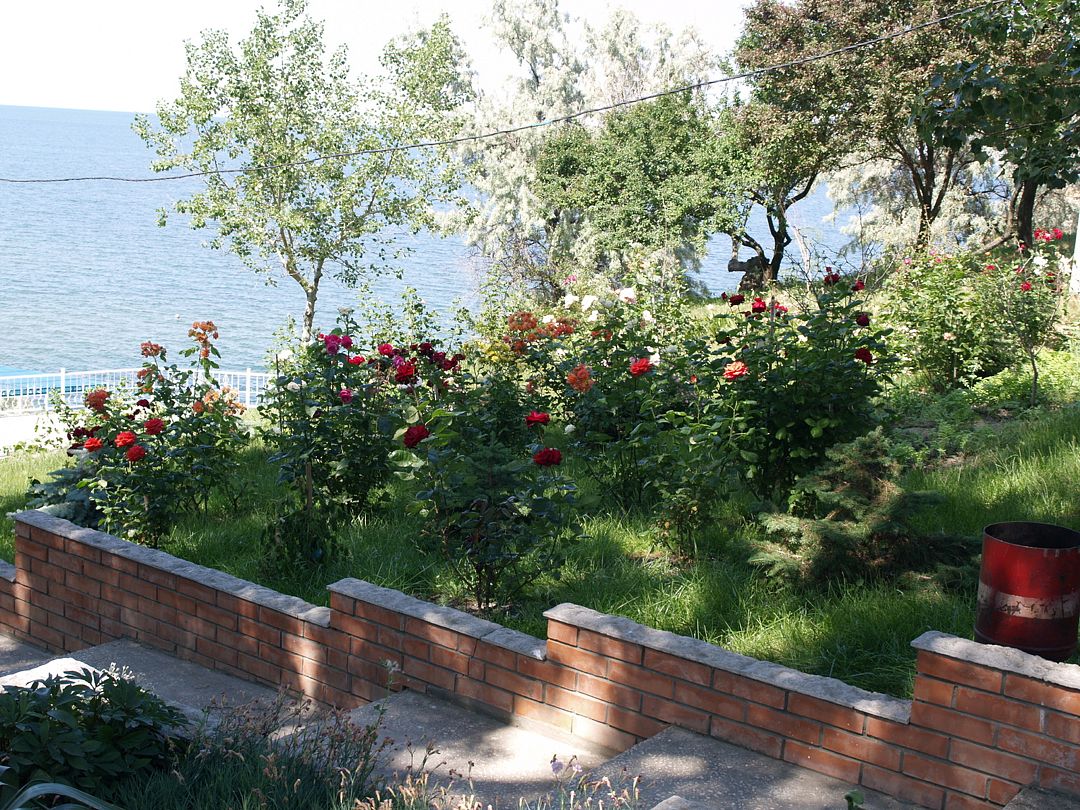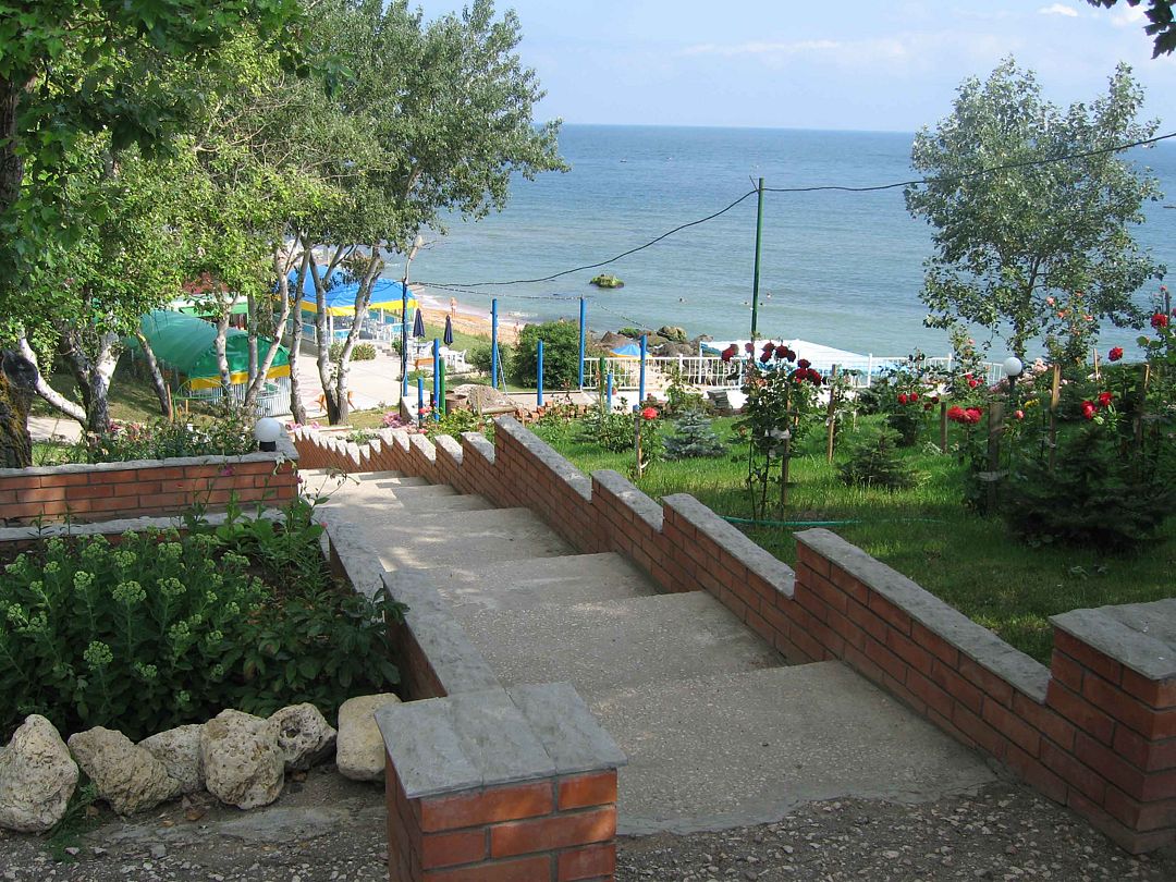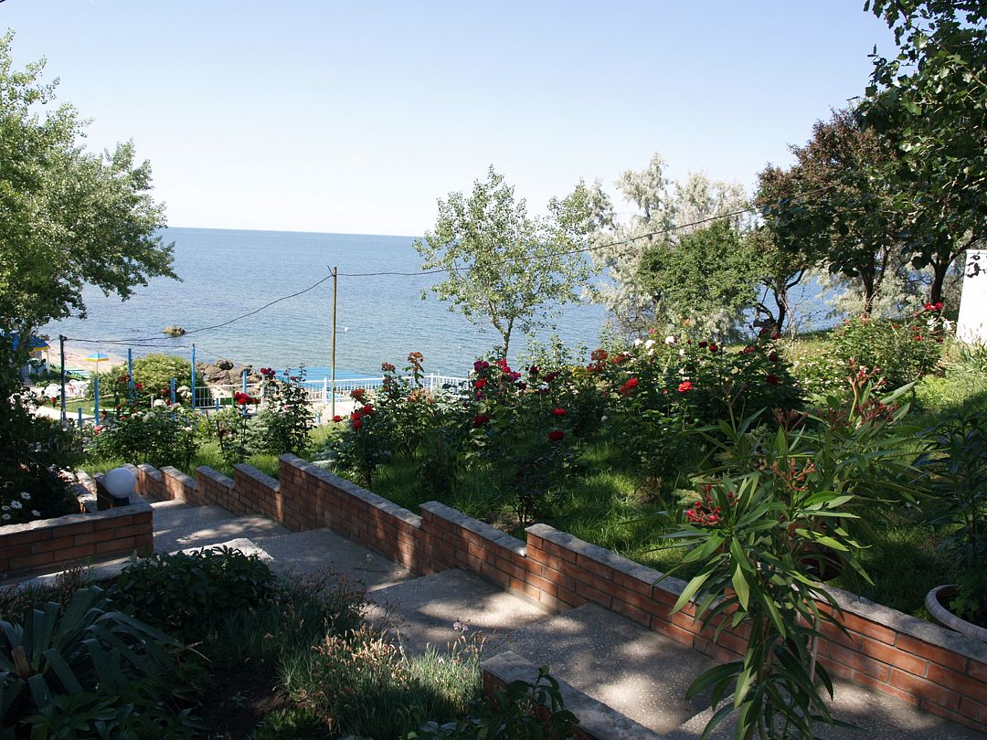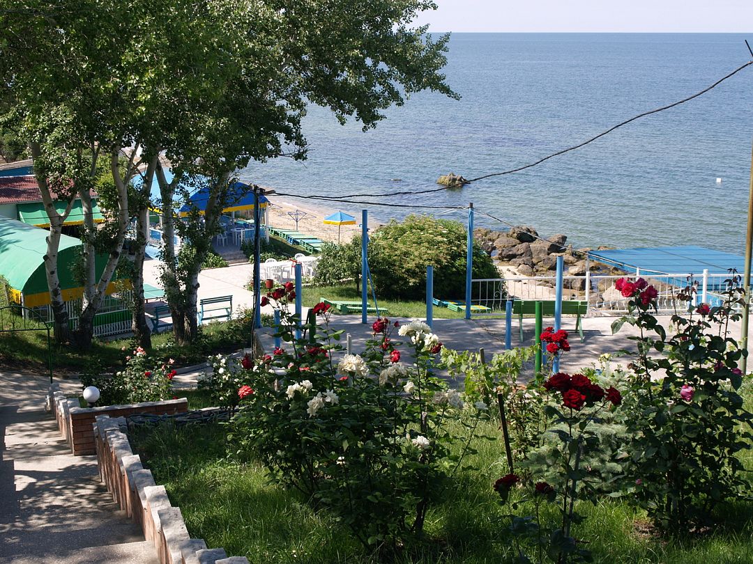 Сразу напротив пансионата располагается собственный песчаный пляж. На берегу установлены навесы, лежаки, зонтики и шезлонги, есть столы для настольного тенниса и детская площадка.