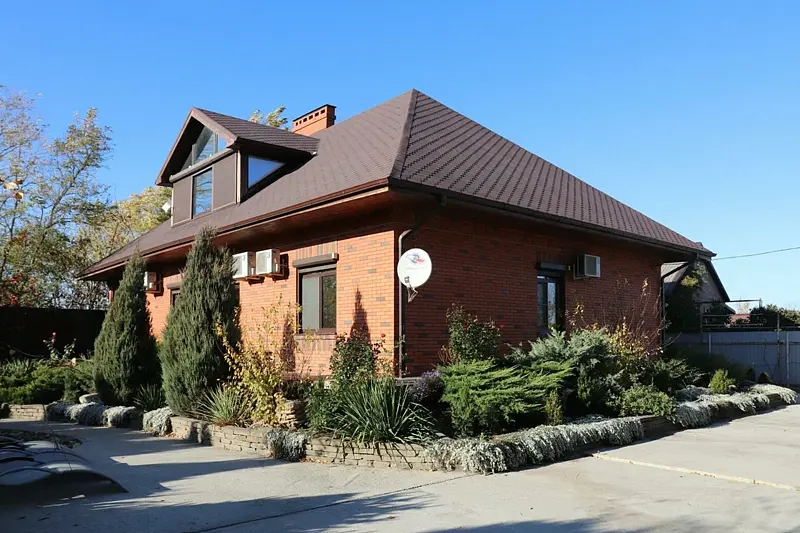 В стороне, под лучами солнца, раскинулся виноградник и плодовый сад, обещающие богатый урожай. Эта гармония природы, баланс цветов и форм делают загородный дом уникальным и умиротворяющим местом.