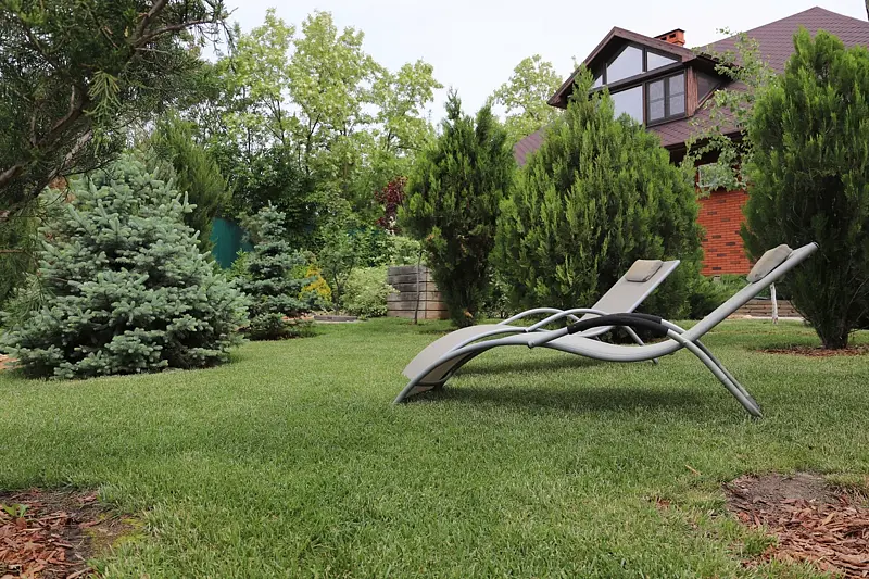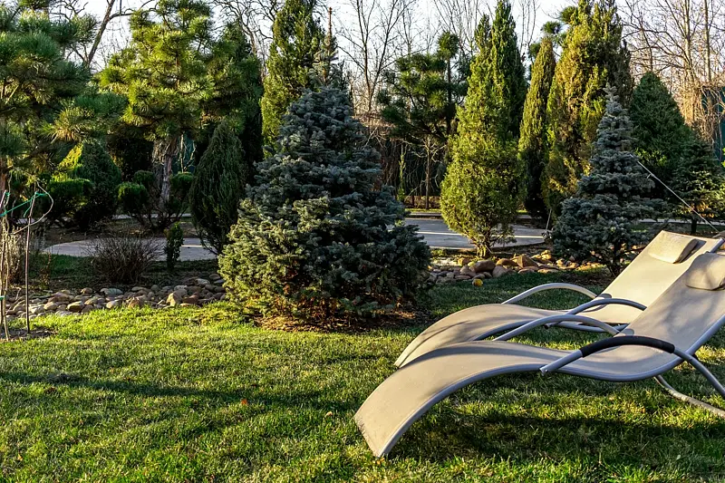 Прямо за пышными кронами сосен, елей и кипарисов укрылся уютный каркасный бассейн, приглашая гостей насладиться освежающей водой и солнечными ваннами на удобных шезлонгах. Это идеальное место для полного релакса вдали от городской суеты, где можно забыть обо всём, наслаждаясь гармонией природы и умиротворяющей атмосферой.